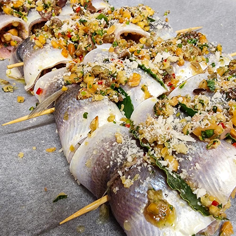 Im Original ein altes, typisch sizilianisches Volksgericht. Sein Name leitet sich vom italienischen „beccafico“ ab, einer Grasmücke, der Singvogel aus der Familie der Sylviidae. Die Vögel picken (beccare) sich mit ihren Schnäbeln an den süssen Feigen (fica) satt und dick. So wurden sie früher (wohl auch noch heute) in Netzen gefangen. Der Adel verlangte nach dieser „Delikatesse“ und liess sich die Vögel mit Eingeweiden und Innereien füllen. Ein angeblich schmackhaftes Gericht, aber für das einfache Volk damals als Luxusgut unerschwinglich. Das Volk, nicht dumm, ersetzte den raren Vogel durch etwas, das an der Küste Sizilien billigst zu haben war: Sardinen.