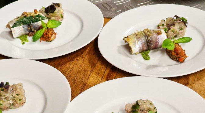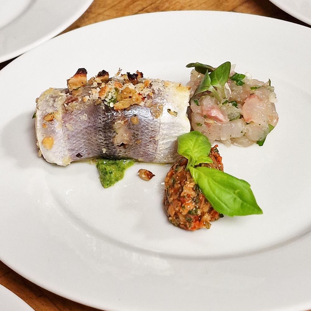 Lucas hatte das Gericht von seiner Sizilienreise mitgebracht. Im Gespräch mit dem Fischhändler auf dem Luzerner Markt hatte er die Inspiration, tagesfrische Albeli anstelle weitgereister Sardinen zu verwenden. Diese Kleinfelche (Renke) hat ähnliche Dimensionen wie die Sardine. Darauf lag es nahe, für den rohen Fisch ebenfalls einen frischen, einheimischen Fisch zu verwenden: eine grosse Felche.