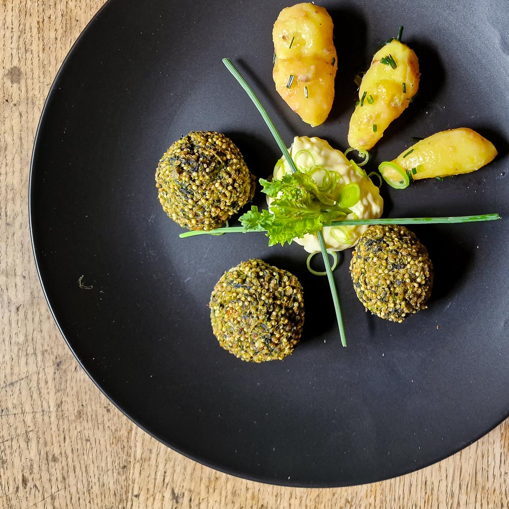 a) Im Dampfgarer 10 Minuten bei 100°C vorgegarte Corne de Gatte Kartöffelchen schälen und in heissem Olivenöl schwenken und salzen. Bestreuen mit Rosslauch (Allium selvaticum)
