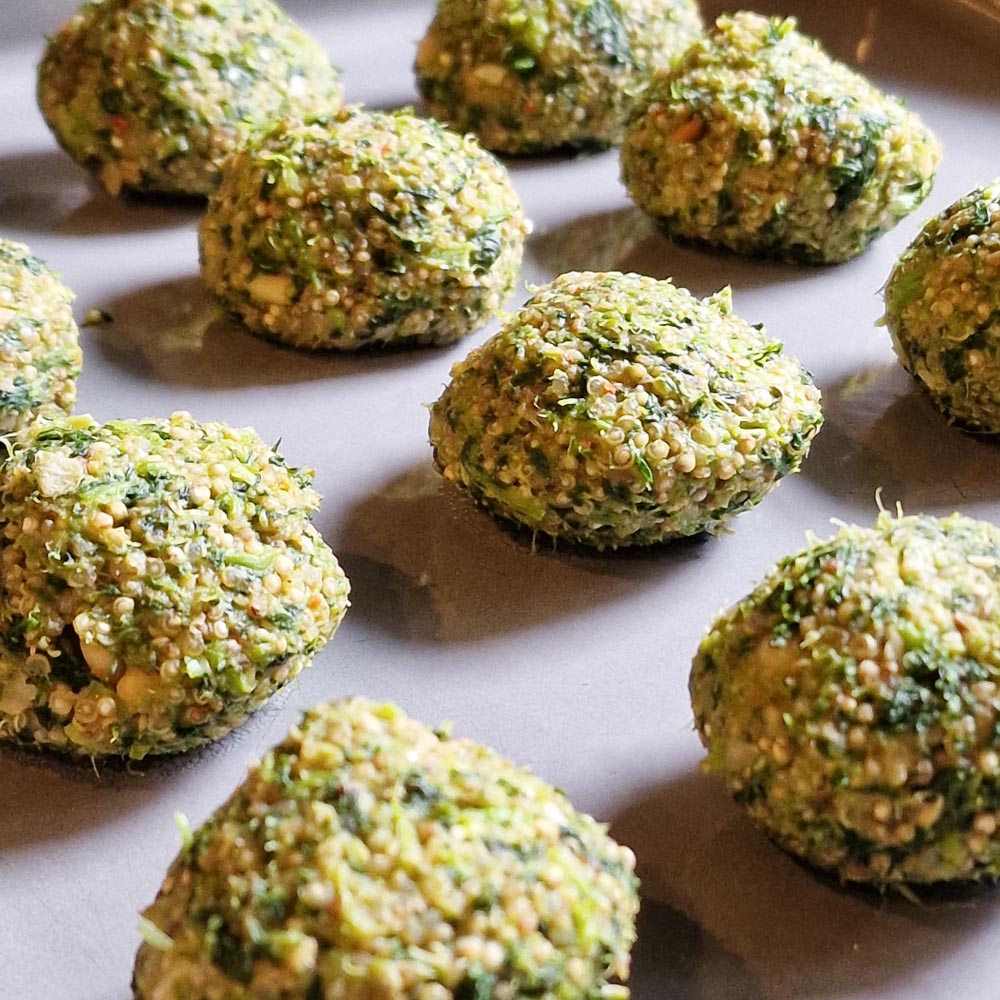 (5) mit nassen Händen Kugeln formen, auf einem mit Backpapier belegten Blech mit wenig Olivenöl beträufeln.