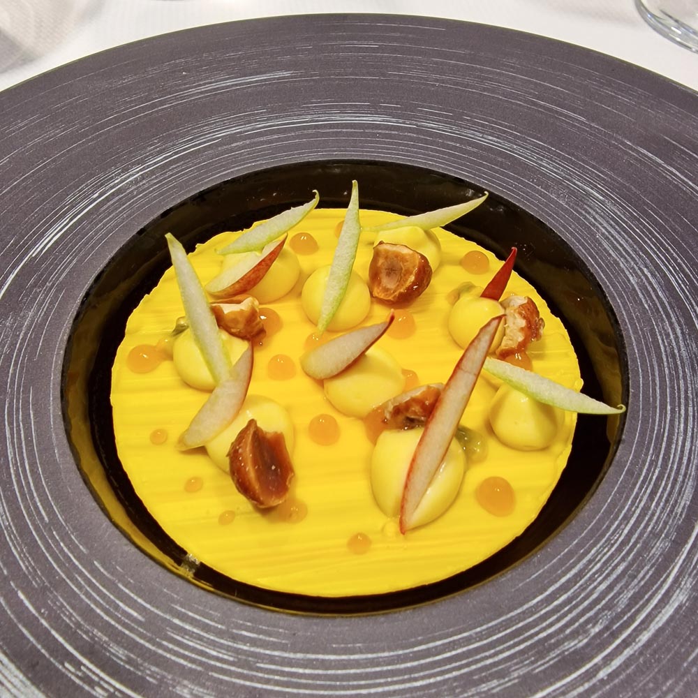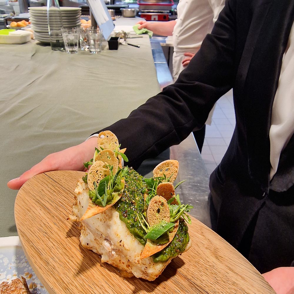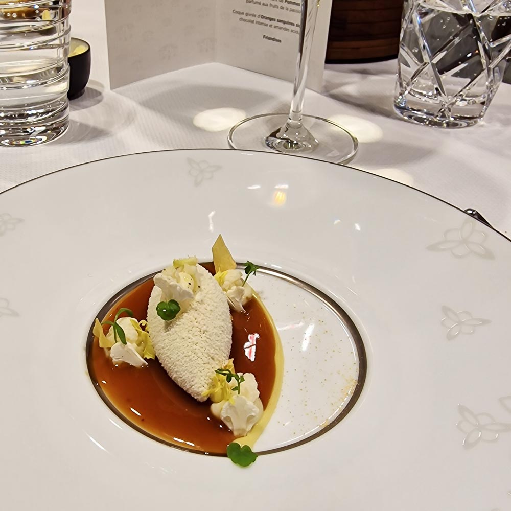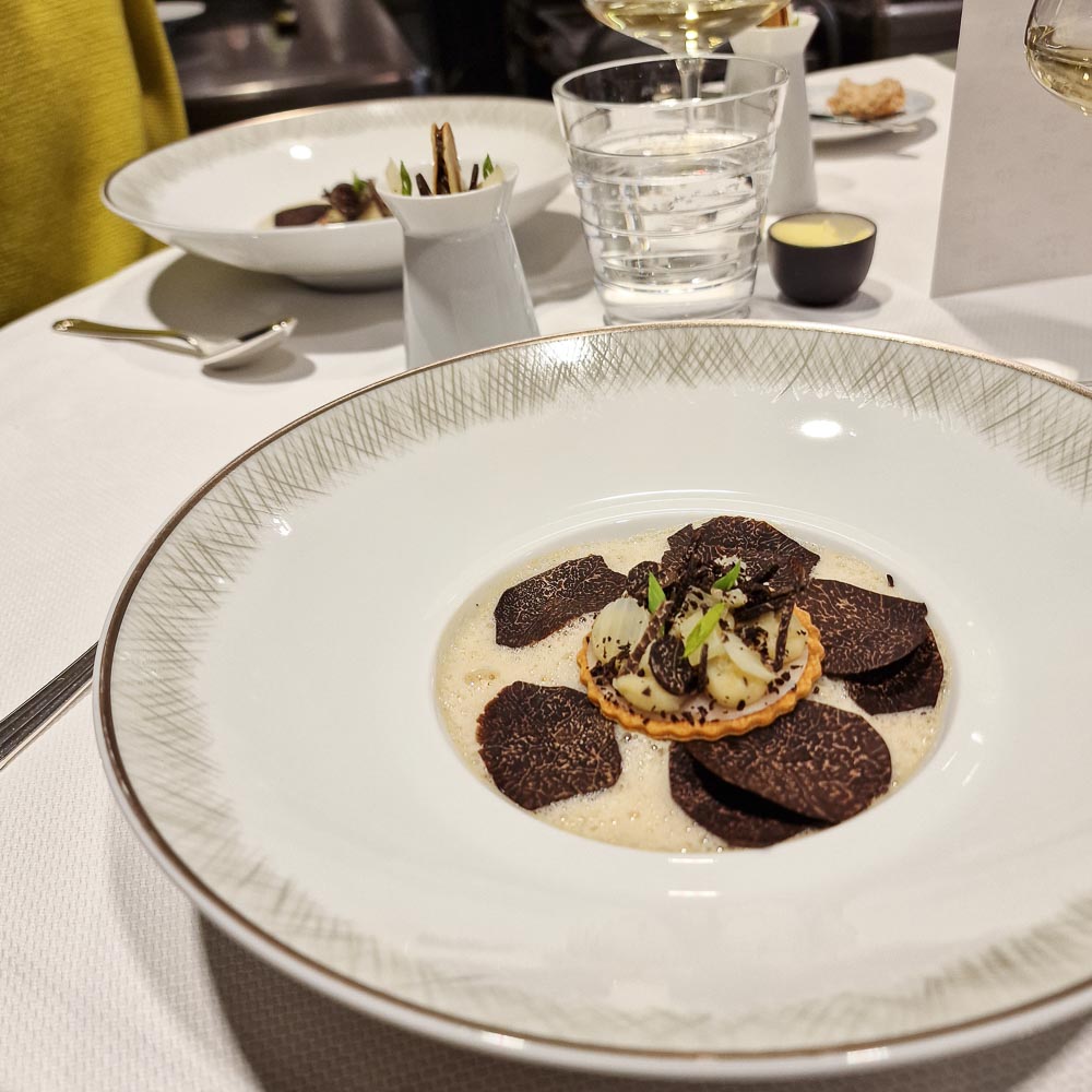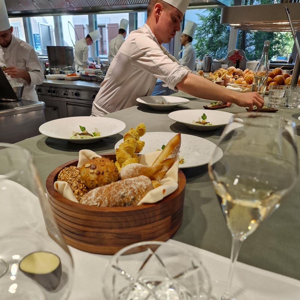 Die Barhocker am Pass (wie auch die 6 Gedecke am chefs table) werden nur belegt, wenn das Restaurant nicht mit grösseren Gruppen ausgelastet ist. Serviert wurde uns das Wintermenu 2023, No° 53 (die Karten werden seit der Aera Violier hochgezählt). Seit Jahren ist das Haus Mittags wie Abends ausverkauft. Zu Recht. Und für das wirtschaftliche Überleben notwendig.