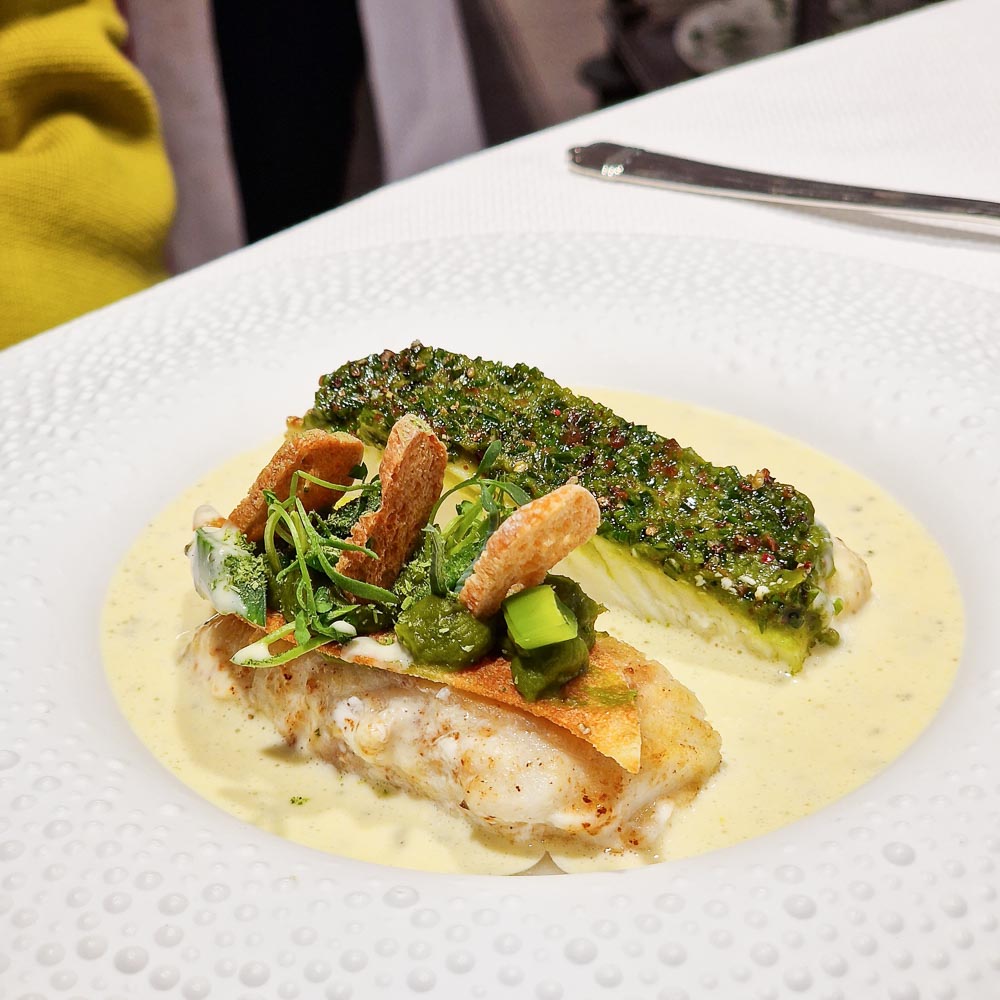 Dos de Barbue rôti sur l’arête aux jeunes poireaux du canton