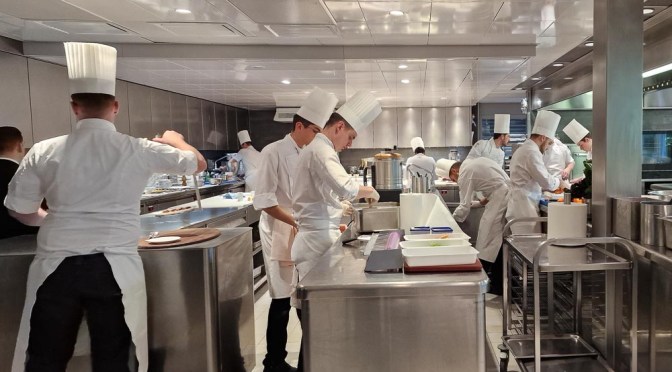Meine heutige Lebenspartnerin, Frau H., die um meine seit 40 Jahren andauernde Wertschätzung des Restaurants weiss, fädelte den Besuch ein und machte mir damit eine Riesenfreude. Als (zahlender) Gast nicht auf bequemen Stühlen in einem der beiden Speisesäle, sondern „au bout du passe“, am Ende des Küchenpasses, auf zwei lehnenlosen Barhockern mit spektakulärer Rundumsicht auf Küche, 25 Köche und die laufend angerichteten Teller. Das angespannte Zuschauen macht die Stuhllehne überflüssig.