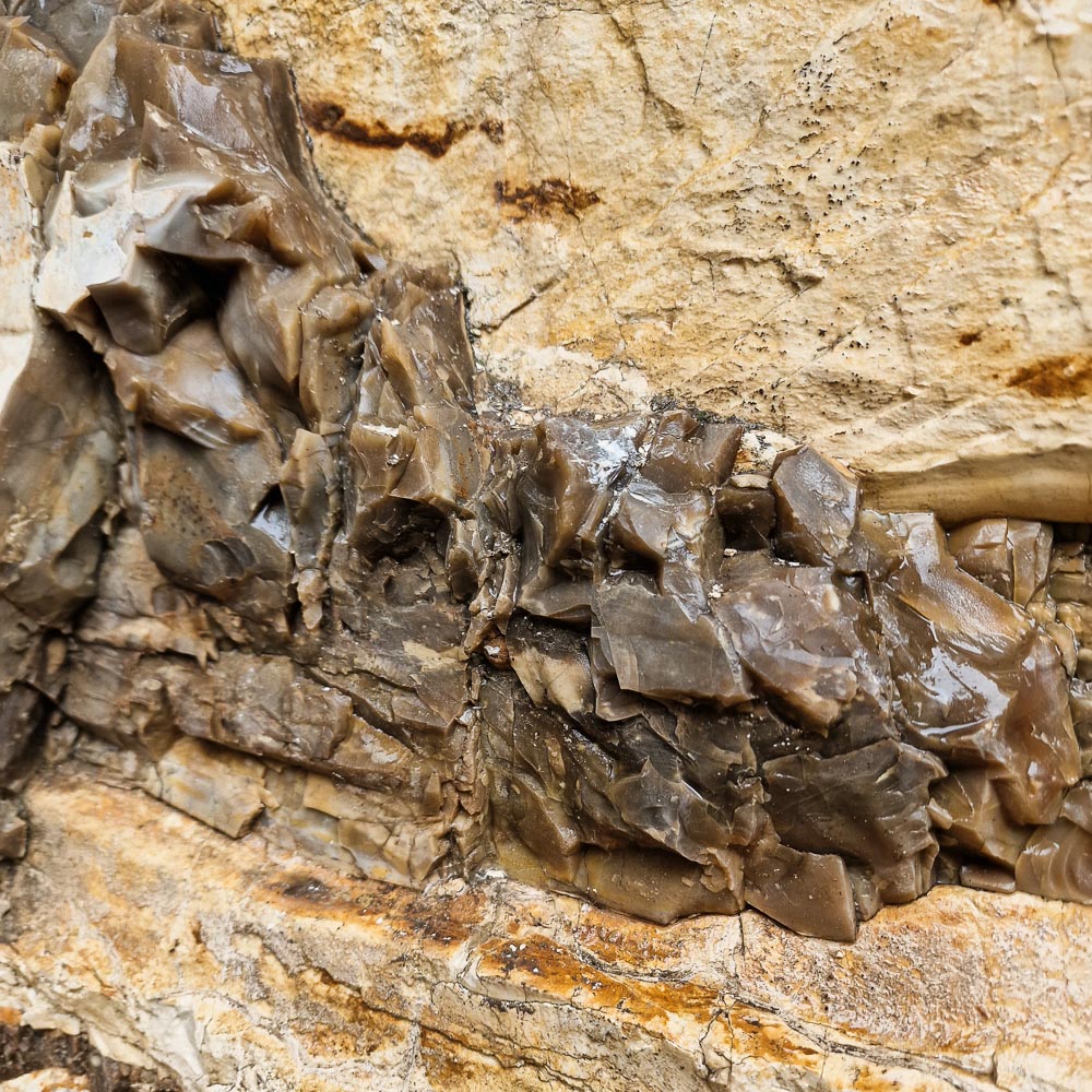 Während der Wanderung trafen wir auf Feuerstein-Adern (Silex). Feuerstein ist ein hartes Kieselgestein das nahezu ausschließlich aus Siliziumdioxid (SiO2) besteht. Die Feuersteinschichten liegen hier 2-20 cm dick eingebettet in Kalkgesteinsschichten.