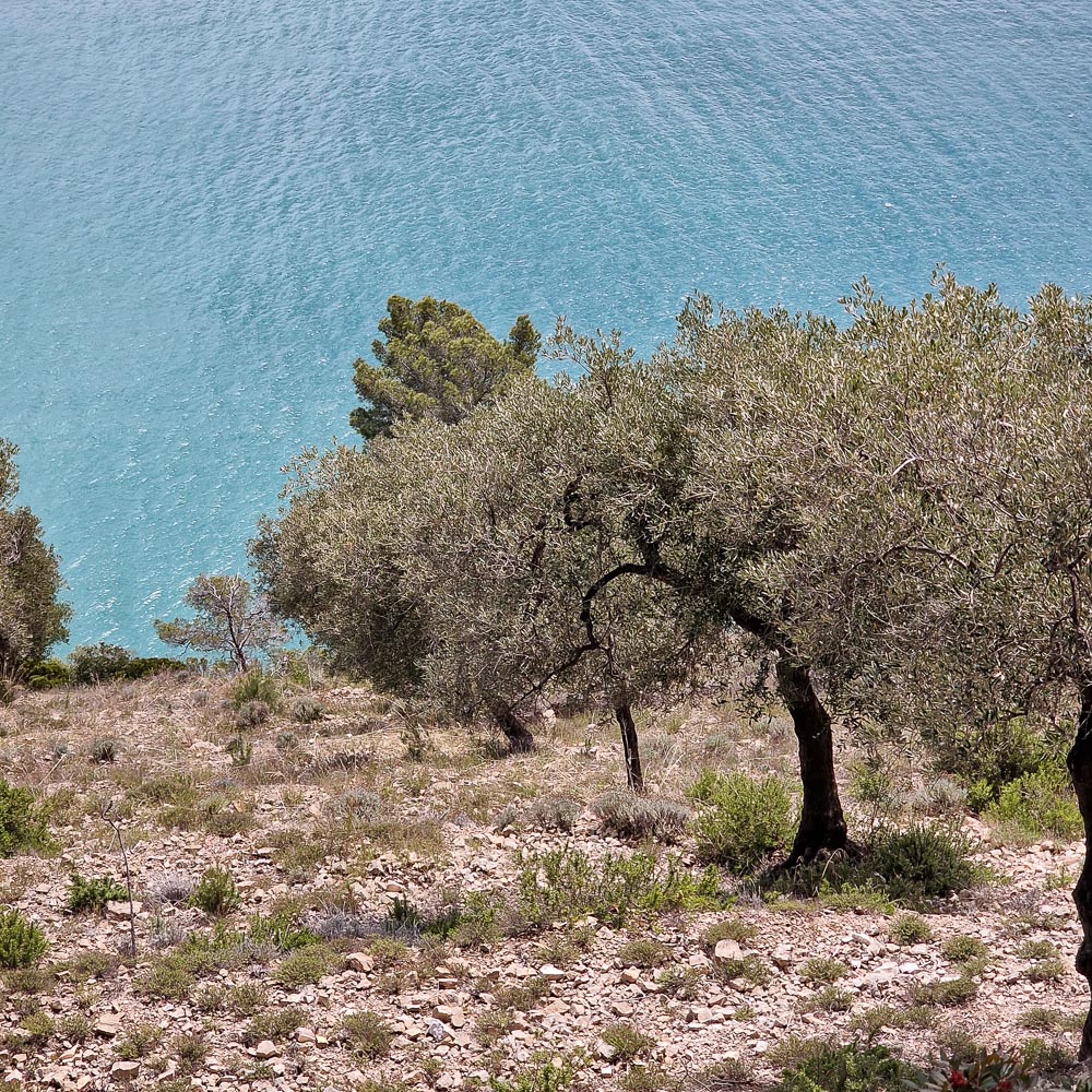 Als ob sie ihre Wurzeln im Meer baden wollten. Steile Olivenhänge.