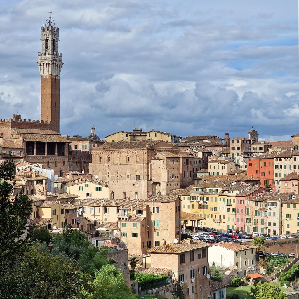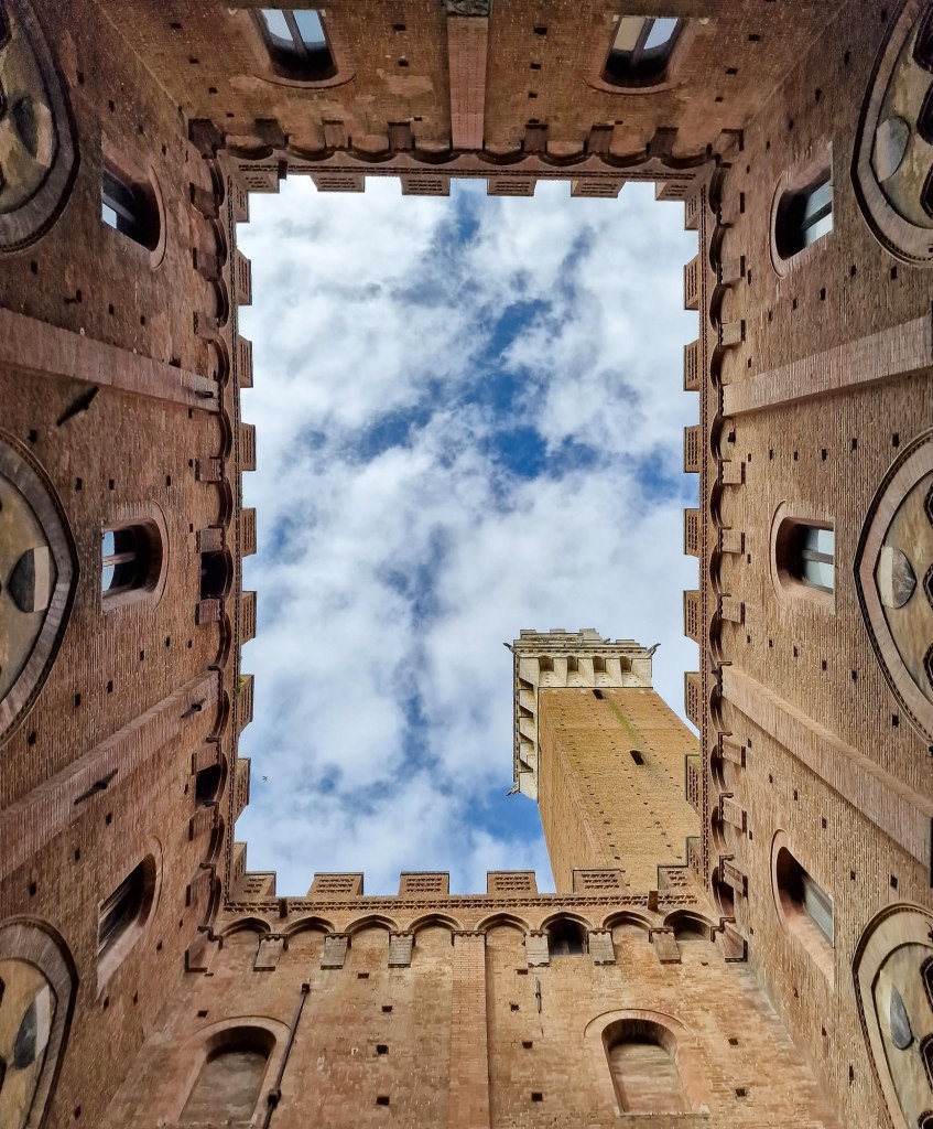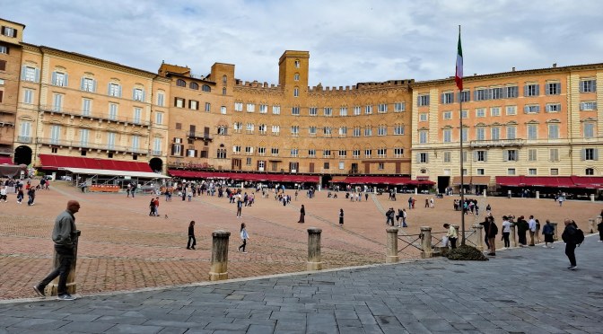 Von unserem Maremma-Häuschen aus liegt Siena eine Fahrstunde entfernt. In Siena haben viele Läden auch Sonntags offen. Ein Tag, an dem auch einheimische Touristen sich in der Stadt vergnügen wollen. Die Piazza del Campo ist halbrund und leicht abschüssig. Am tiefsten Punkt stehen der Turm und der Palazzo Pubblico, das Rathaus. Der Turm des Palazzo Pubblico, der Torre del Mangia, wurde zwischen 1325 und 1344 errichtet, ist ohne Blitzableiter stattliche 87 Meter hoch und steht fest auf einem aus Ziegelsteinen erbauten Sockel.