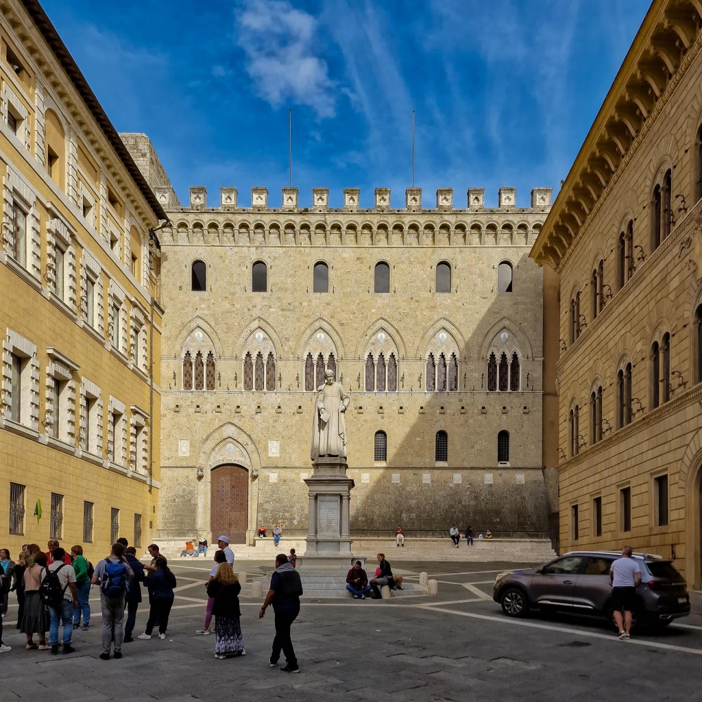 Palazzo Salimbeni, Erbaut wurde der Palazzo ursprünglich als Festung von der damals mächtigen Seneser Familie der Salimbeni im 12. Jahrhundert. Aufgrund mehrerer Versuche, die Macht in der Stadt an sich zu reißen sowie ihrer guelfischen (Papstfreundlichen) Gesinnung wurde die Familie 1419 aus der (Kaiserfreundlichen) Stadt verbannt und all ihre Güter von Stadt und Republik konfisziert. Heute ist es der Hauptsitz der Bank Monte dei Paschi di Siena, die älteste noch existierende Bank der Welt.