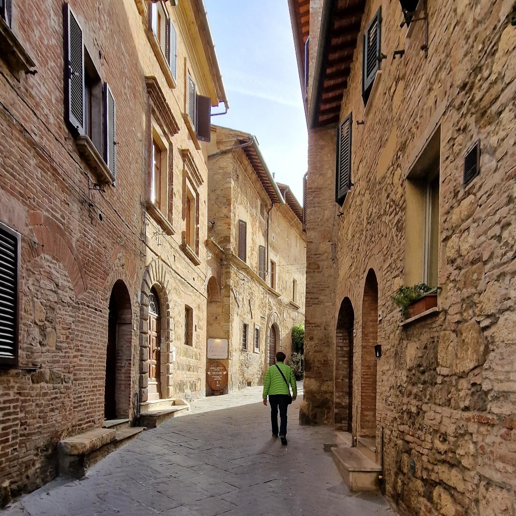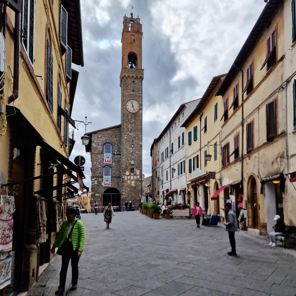 Der nächste Tag begann in Wolken, wiederum eine Stunde Fahrt bis Montalcino. Der Ort war über Jahrhunderte ein Spielball der Mächte aus Siena und Florenz. Siena gewährte den Bürgern aus Montalcino die Seneser Staatsbürgerschaft, errichtete 1361 die Festung Fortezza und verstärkte die Stadtmauern. Im Zentrum der neoklassisch erneuerte Duomo. Berühmt ist der Ort heute durch den Weinbau. Der Brunello di Montalcino ist einer der teuersten Spitzenweine Italiens.