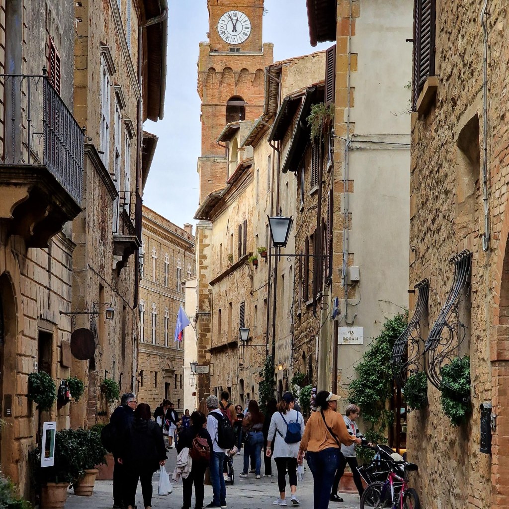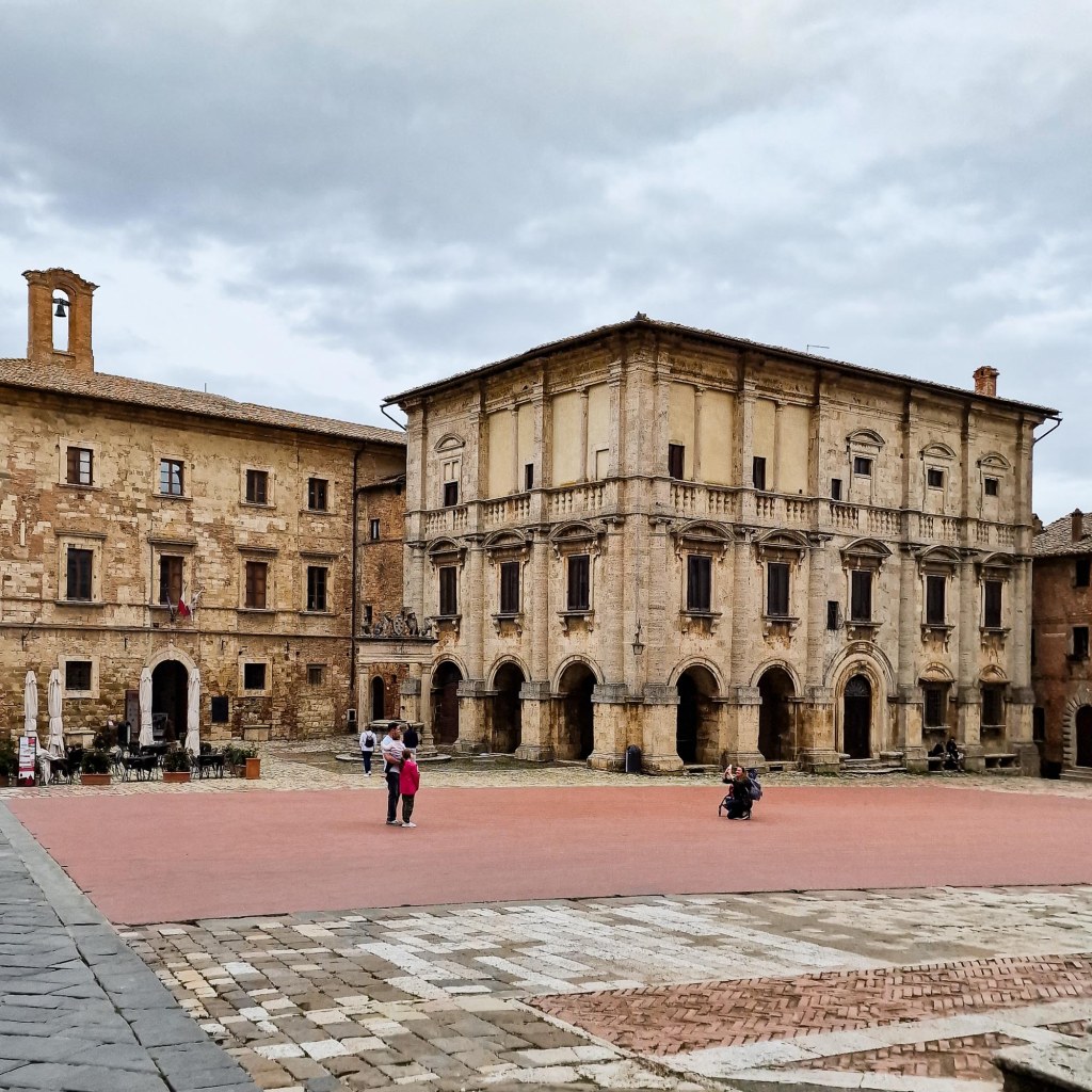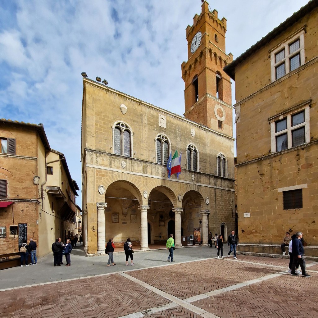 1459 begann Pius als Pontifex Maximus mit dem Ausbau seines Geburtsortes zu einer (winzigen) Stadt. Das von einem Florentiner Architekten verwirklichte Projekt kam den städtebaulichen Schönheits- Idealen der Renaissance sehr nahe. Schön der asymetrische Hauptplatz, elegant der Knick in der Hauptstrasse, dem Corso Il Rosselino, der verhindert, dass man von einem Stadttor zum andern hindurchblicken kann.