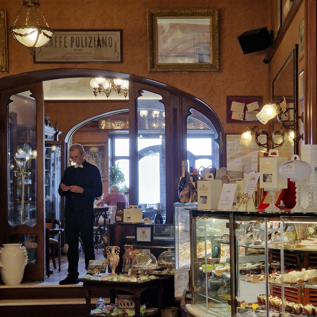 Viel Zeit blieb uns nicht mehr, uns in Montepulciano umzusehen. Blick ins alte Jugendstil Caffè Poliziano.