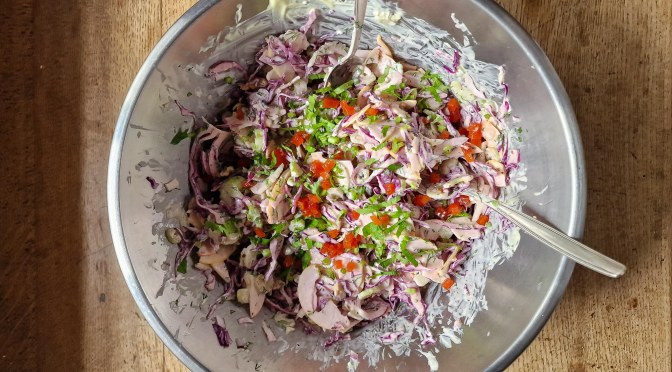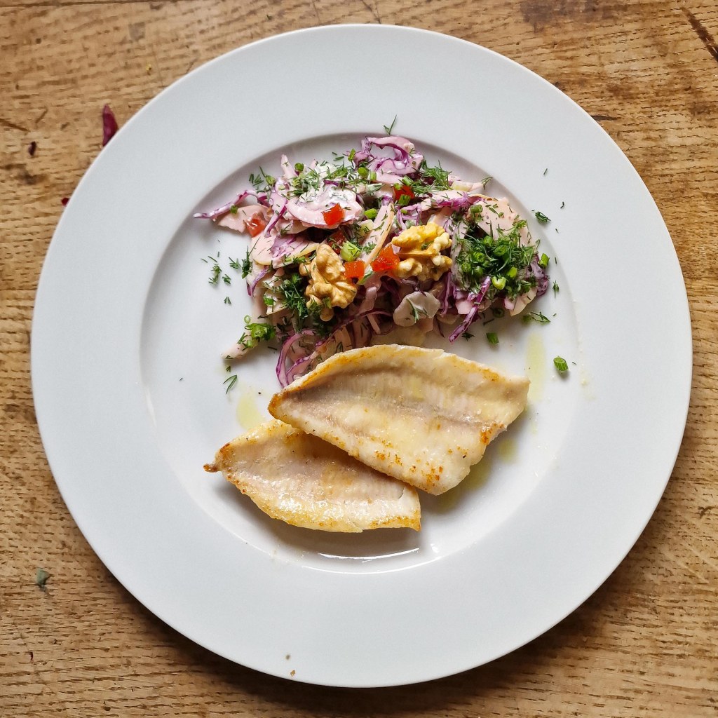 Die Radiosendung war für mich Ansporn, den Salat in veränderter (andere sagen „verhunzter“) Form mit gebratenen Egli zu kombinieren und gleichzeit wieder ein paar kandierte Quittenwürfel los zu werden. Der beredte Oscar Tschirky benötigte für das Rezept 4 Zeilen, ich über 30 Zeilen. Was mache ich wohl falsch?
