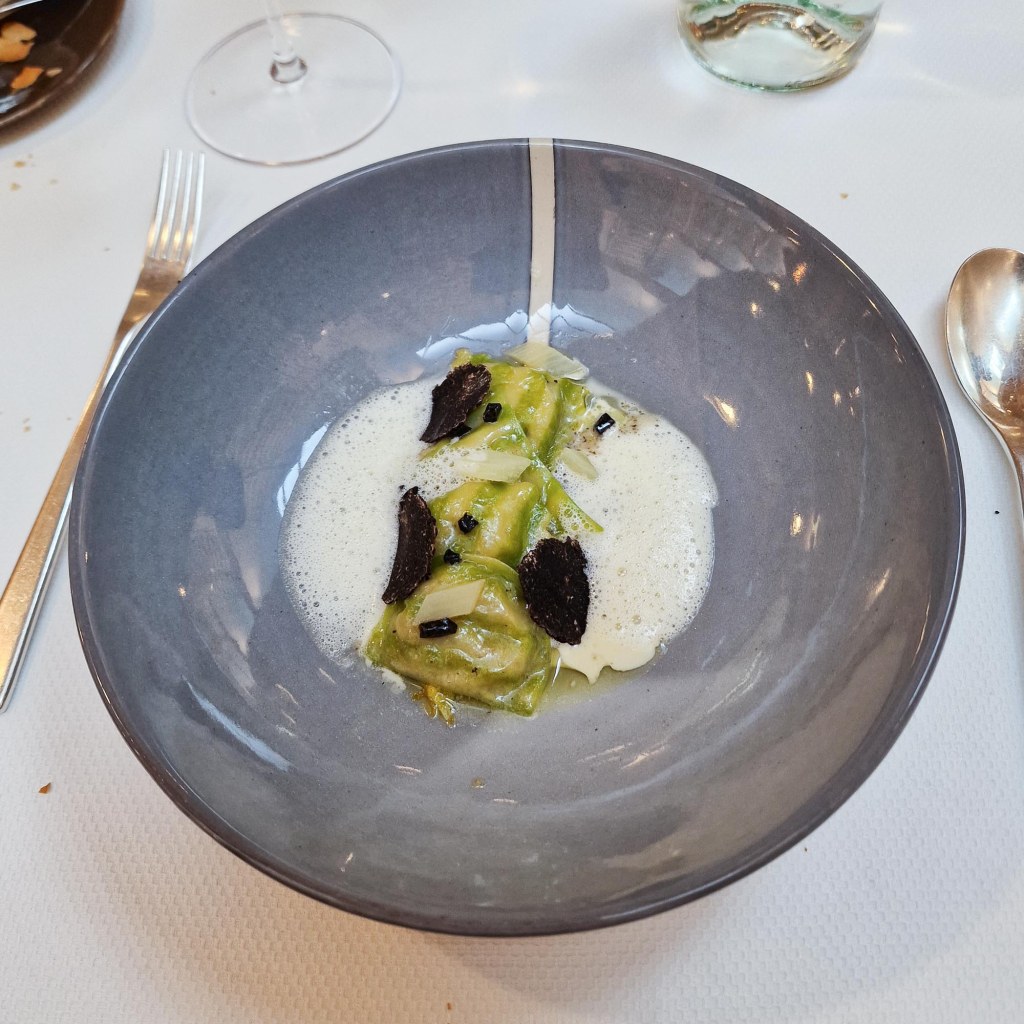 Endive – Truffe noire du Périgord (fein gewürfelte Cardons und Endivie in Ravioli, sowie Streifen von Cardons und Trüffeln, mit Parmesanschaum serviert)