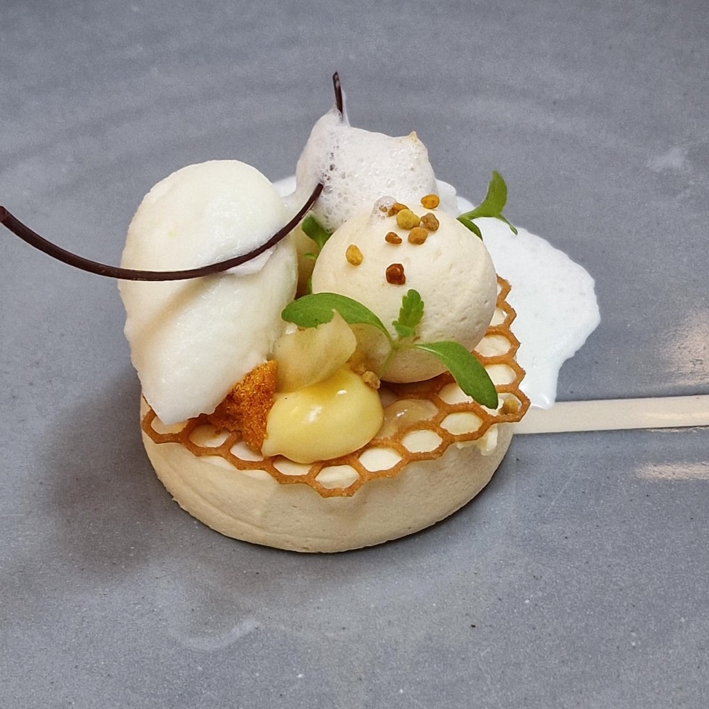 Citron – Poire (Dessertkreation mit Honig, Zitrone und Birne, Bisquit mit Honiggitter)
