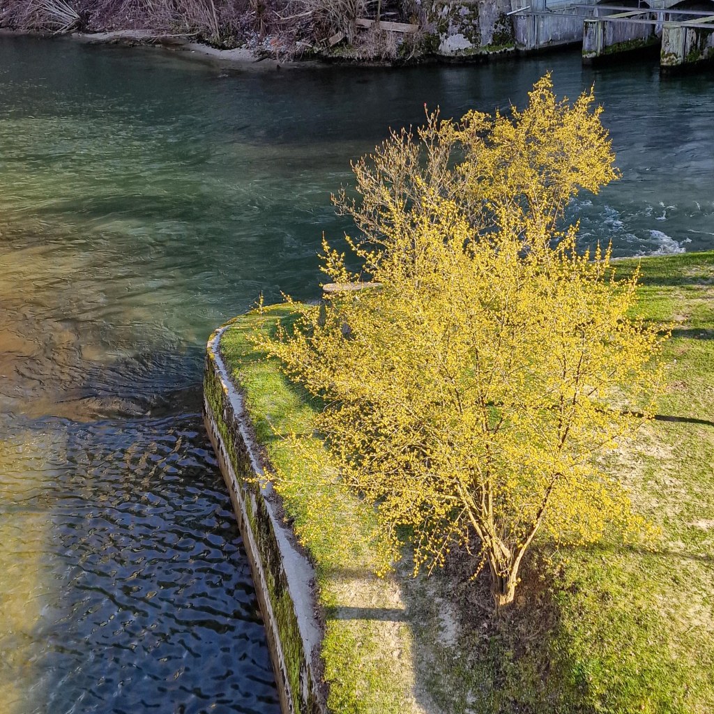 Blühender Tierlibaum (Kornelkirsche, cornus mas) am Ufer der Saane. Doch die Zeit liess keine weitern Kontemplationen zu: Mit der wasserbetriebenen Standseilbahn fuhren wir wieder in die Oberstadt und erreichten, ausser Atem, unsern Zug. Die zuhause gebliebene, hungrige Hundedame verlangte dringend nach ihrem Essen: weder vegan noch vegetarisch.