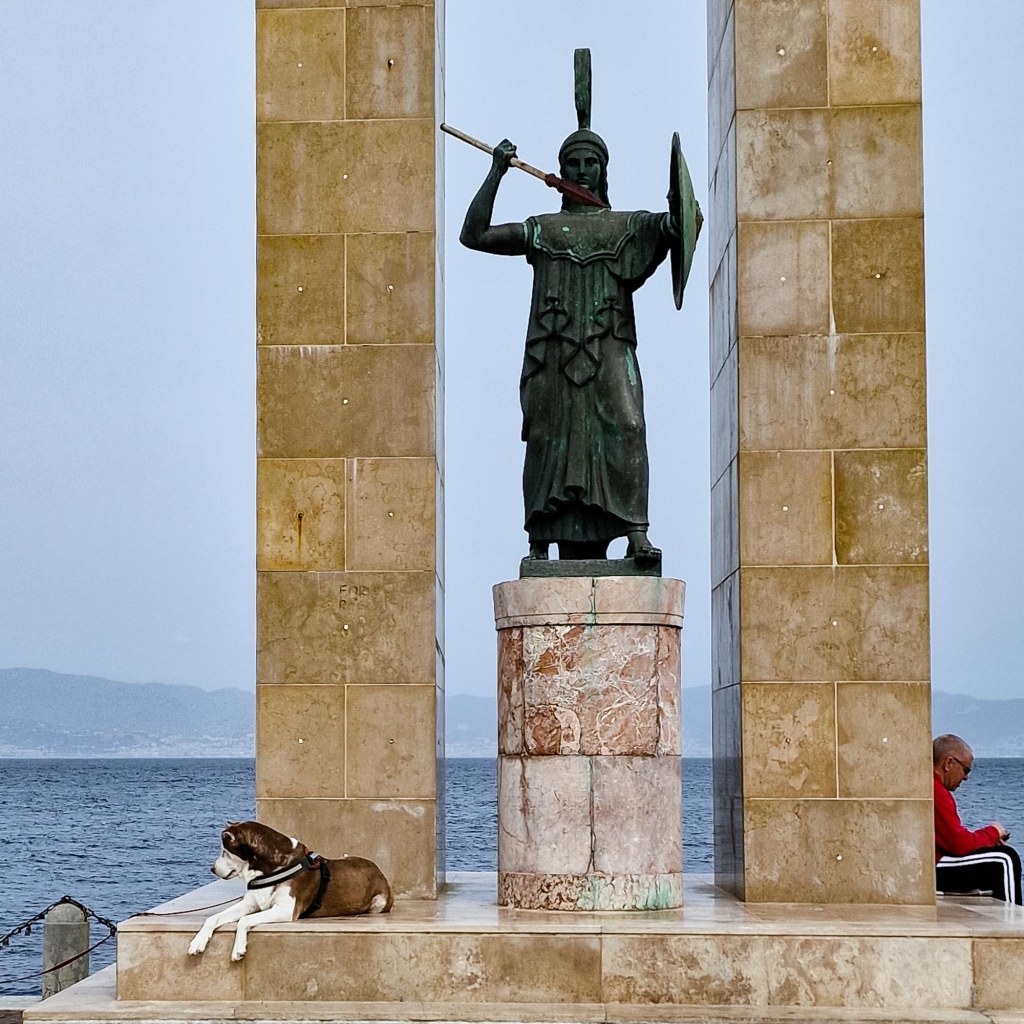 Nach einem Zwischenhalt mit Abendessen in Rom war der Endbahnhof unserer Hinreise diesmal Reggio di Calabria. Wo vor Jahren der Zugang zum Meer durch Eisenbahngleise verbaut war, ist heute eine wunderschöne, 1.7 km lange Uferpromenade (Lungomare Falcomatà, „der schönste Kilometer Italiens“) entstanden. Hund und Bronzestatue der Göttin Athena Promachos beschützen die Stadt. Gegenüber im Saharastaub-Dunst winkt Sizilien.