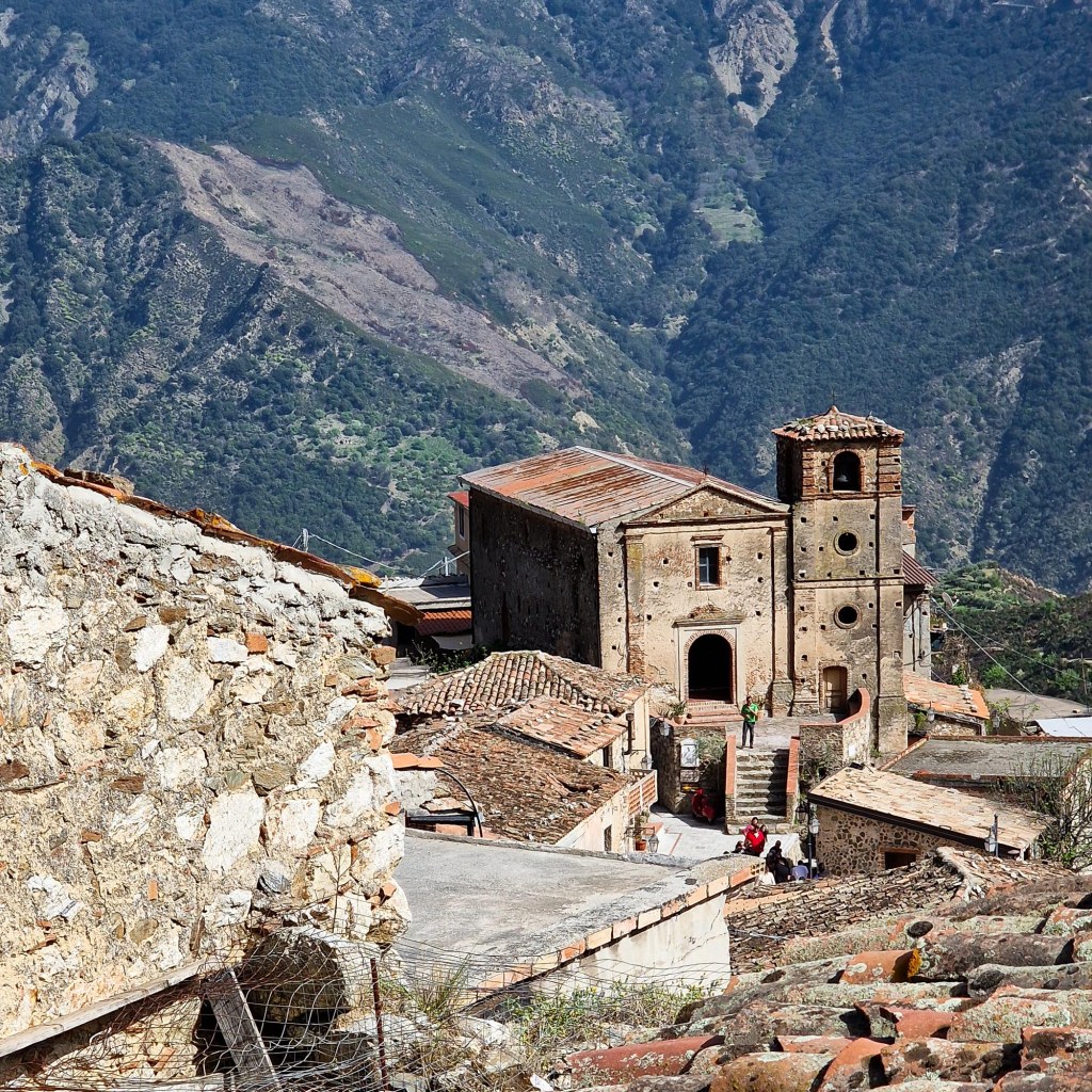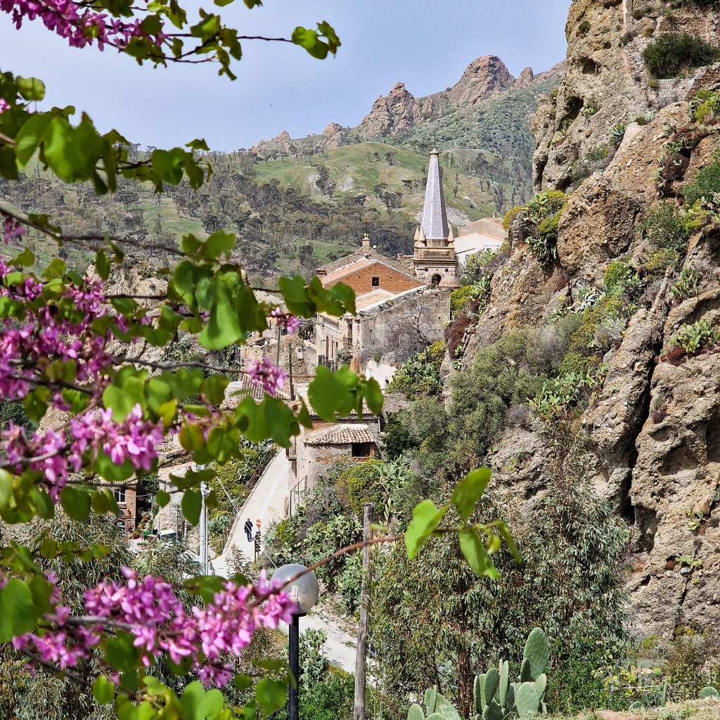 Im kleinen, grekanischen Bergstädtchen Pentedattilo auch heuer unsere erste Wanderung im Aspromonte. Das Dorf hat seinen Namen von der Form der Klippe des Monte Calvario: eine riesige Hand mit fünf Fingern. Eine griechische Gründung, die aus dem 7. Jhdt. vor Chr. datiert. Direkt unter diesem Berg entstand zuerst die Burg, später die Altstadt. Ein schön wiederhergerichtetes, aber nahezu unbewohntes Kleinod mit Kirche und Bar, eingebettet in eine aussergewöhnliche Naturlandschaft. Die roten Blüten gehören zu einem Judasbaum, Cercis siliquastrum.