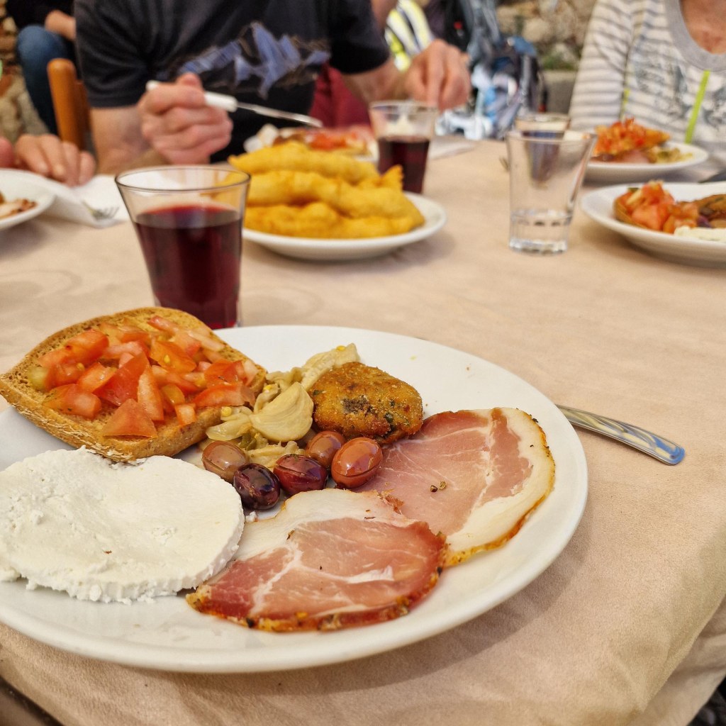 Ein österliches Festessen. Hier der Antipasto-Teller. Köstlich die frische Ricotta aus allem, was Milch liefert. Begleitet vom allgegenwärtigen Nerello calabrese und österlichen? Zeppoline.