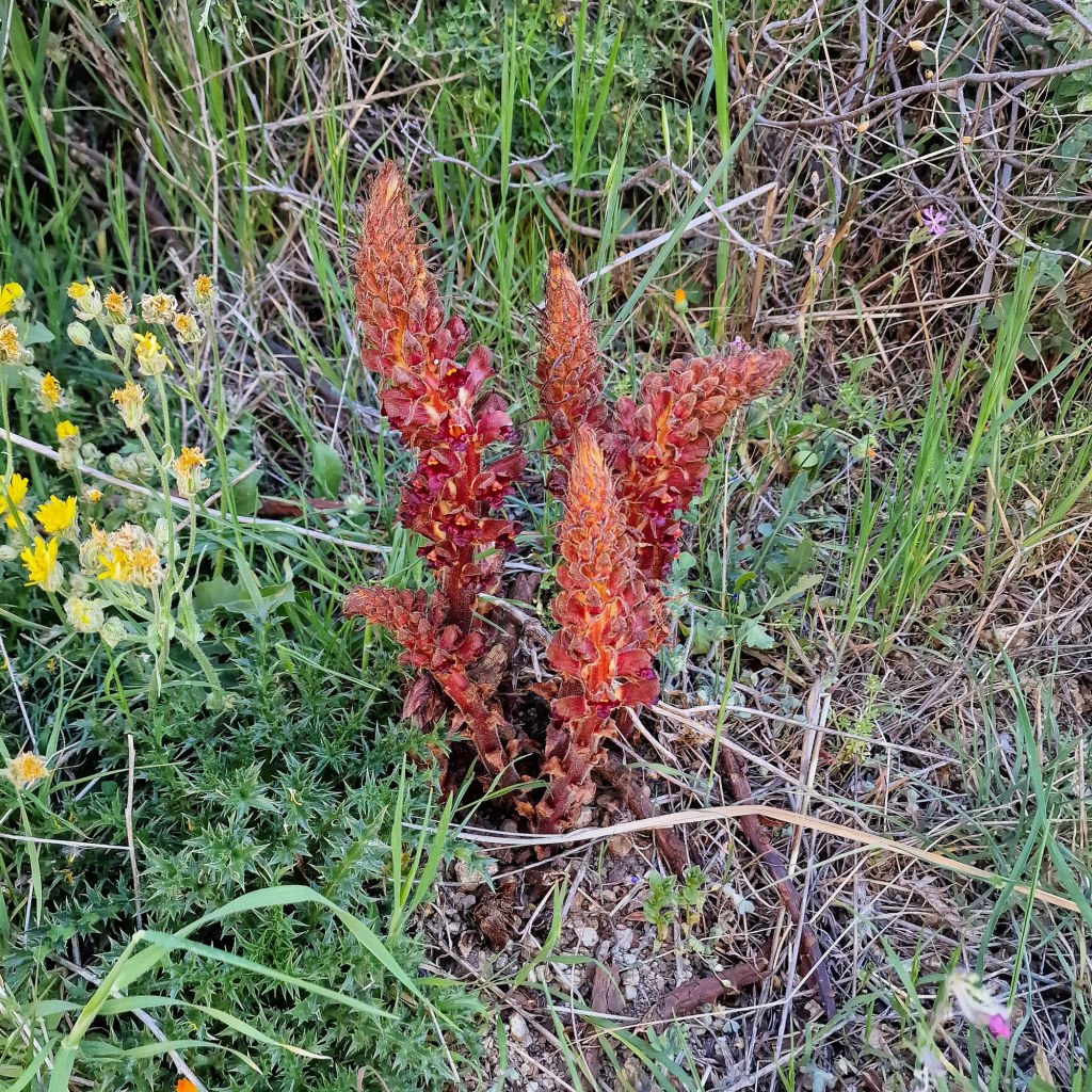 Gefolgt vom Blutroten Sommerwurz, Orobanche gracilis, ein Schmarotzer, der sich hier auf Ginsterwurzeln breit macht.