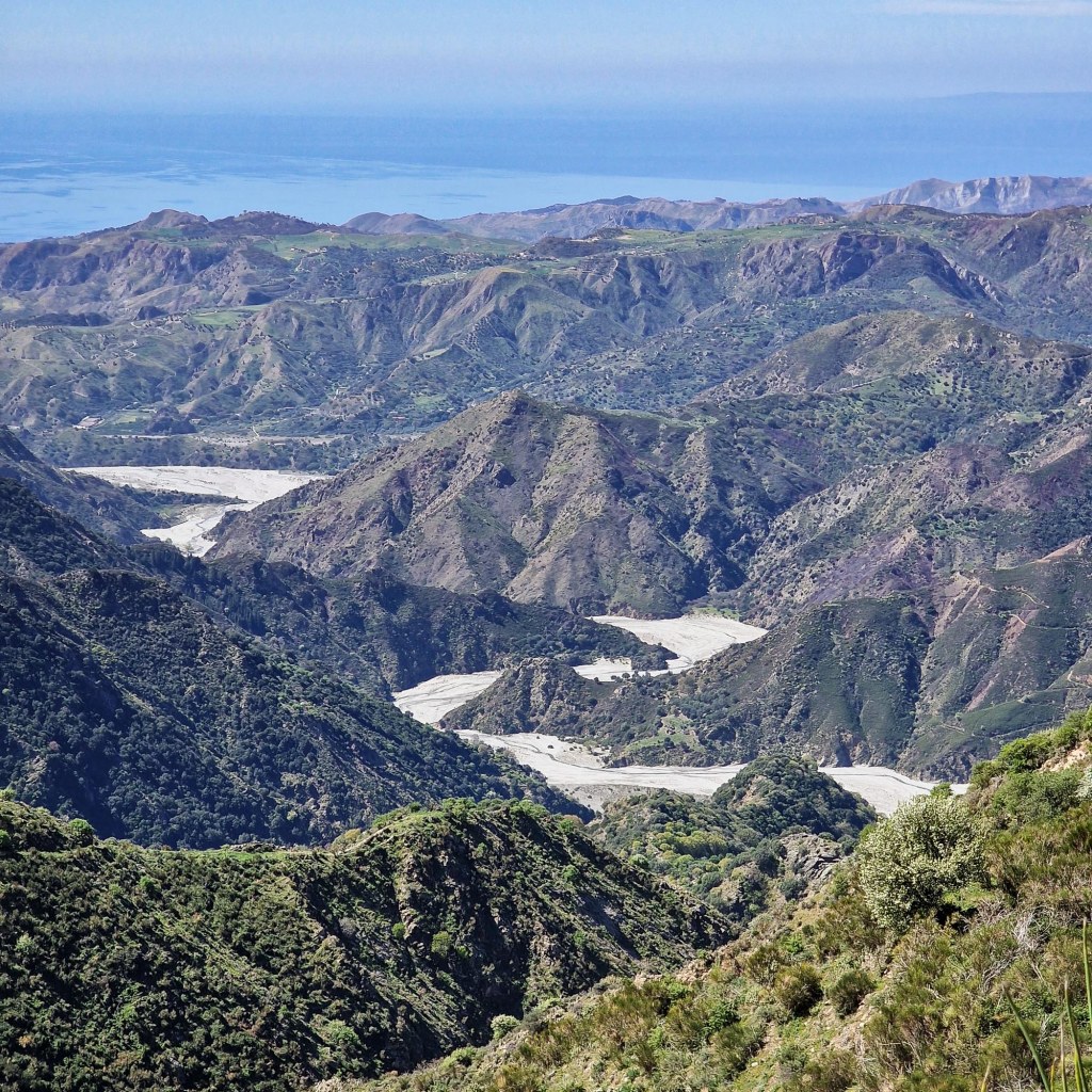 Tief unten schlängelt sich die Fiumara d’Amendola Richtung Meer.
