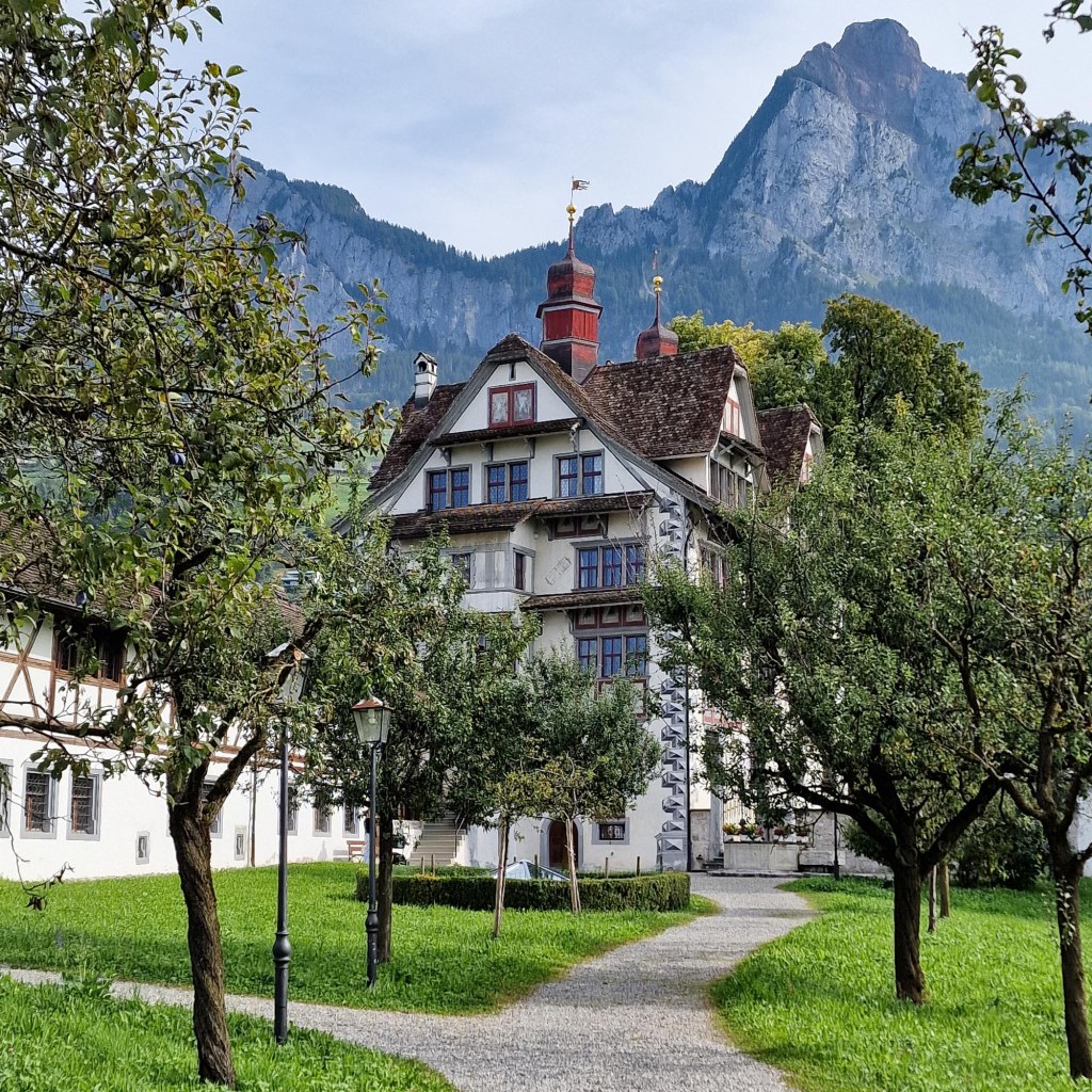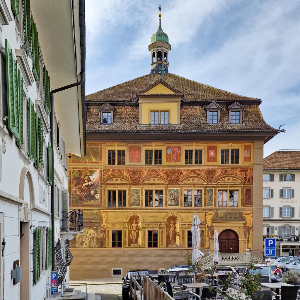 Einem spontanen Einfall von Frau H. folgend, begaben wir uns nach Schwyz, schlenderten faul im Städtchen herum -zum Melken war es schon zu spät-, bewunderten die kolossalen Wandmalereien von Ferdinand Wagner (1847–1927), dem Hofbräu-Historienmaler aus München, der 1891 im Rahmen der 600-Jahr-Feier der Eidgenossenschaft die Fassadenmalerei am Rathaus Schwyz anbrachte. Interessanter die Ital Reding Hofstatt, Landvogt und Bannerherr Ital Reding (1573–1651) liess das stattliche Haus 1609 errichten. Ital Reding stammte aus einer angesehenen Schwyzer Familie, welche in verschiedenen Generationen Heerführer, Landammänner und Diplomaten hervorbrachte und die durch das Soldunternehmertum reich wurde.