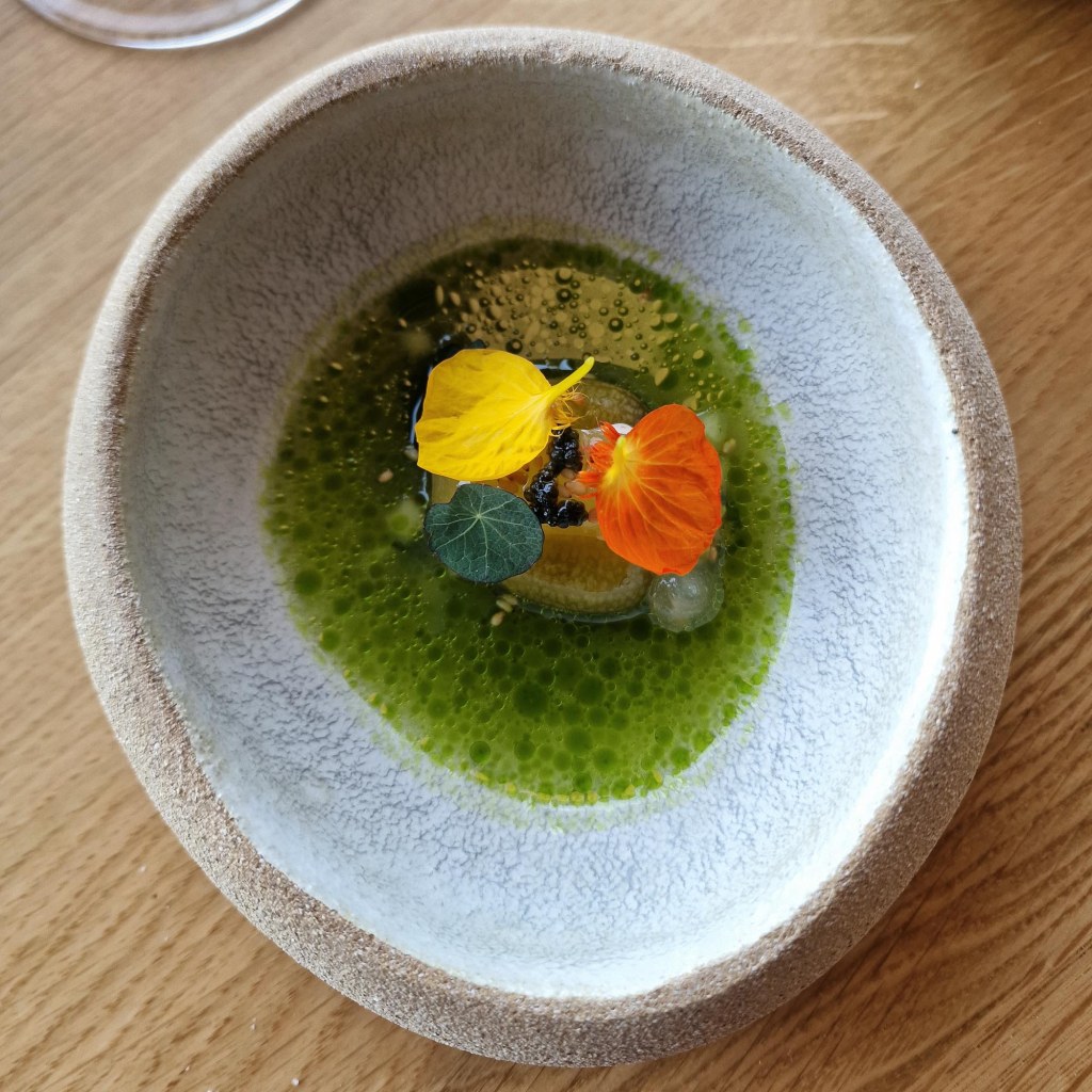 Tolle Reise…. Tendenziell, sehr ambitionierte Küche…… Kleines Manko benötigen wir einen Yuzu- Kern….. das Kalamansi- Etwas, definitiv aus dem Froster von unseren französischen Freunden im Kilopack und zum Ende hin das Shisoblatt….. Alle Dinge aus der Abenteuerabteilung des Feinkost Paradieses in München, Zürich, Berlin, sonst wo….. Ich vermisse frischen Wermuth, entsprechend Pimpernelle….. Aber vielleicht liegt es daran, dass ich heute mit frustrierten Blicke die letzten tollen frischen Kräuter in Augenschein genommen habe und ich mich in Gedanken bereits bei herbstlichen Spezialitäten wie Blutwurst, Steinpilzen, Wild und Aligot de l´Aubrac befinde.
