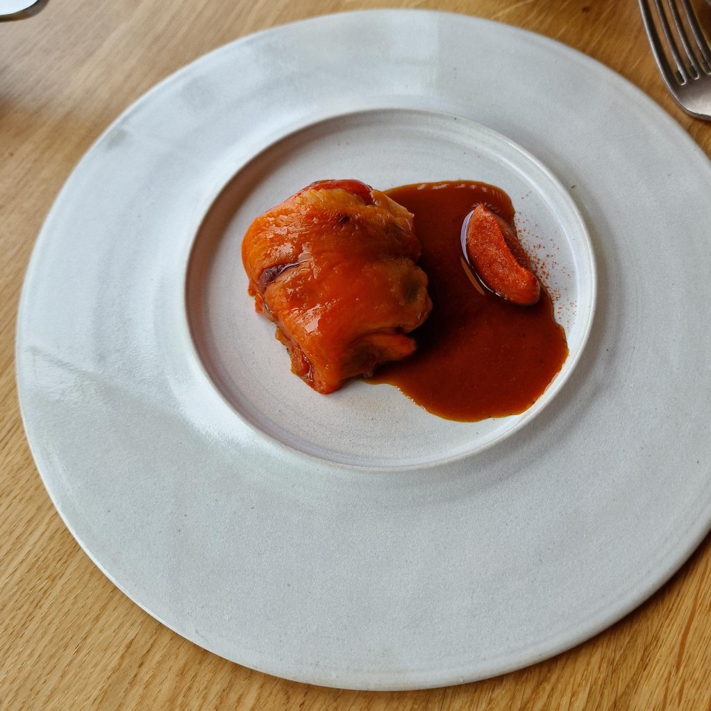 Sous-vide gegarte und dehydrierte Aubergine mit Aprikose in einem mit Miso-Lack überzogenen Peperonimantel an einem kräftigen Jus.