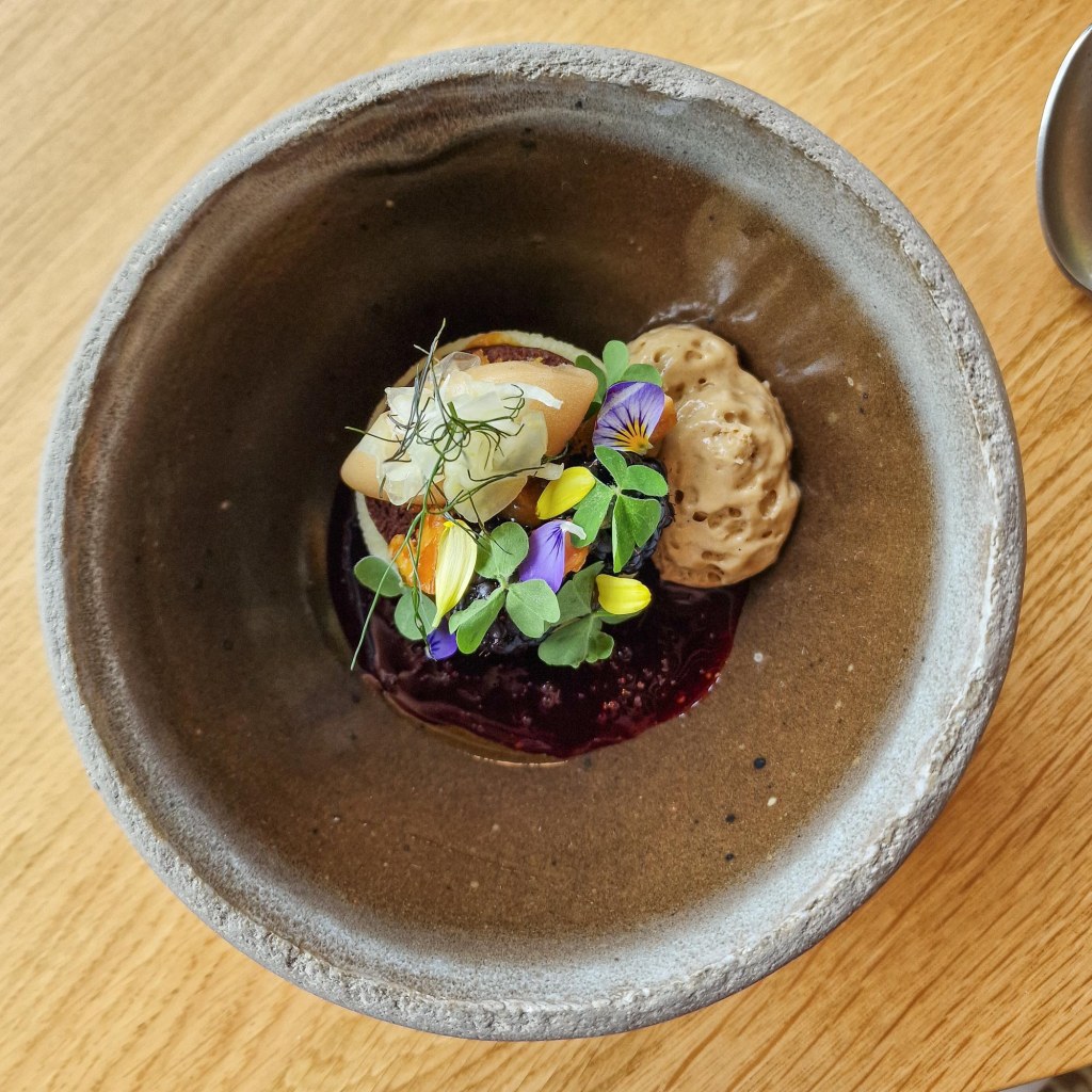 Als Pré-Dessert Mirabellen mit frittiertem Shisoblatt und Pumpernickelcreme. Ohne Bild.