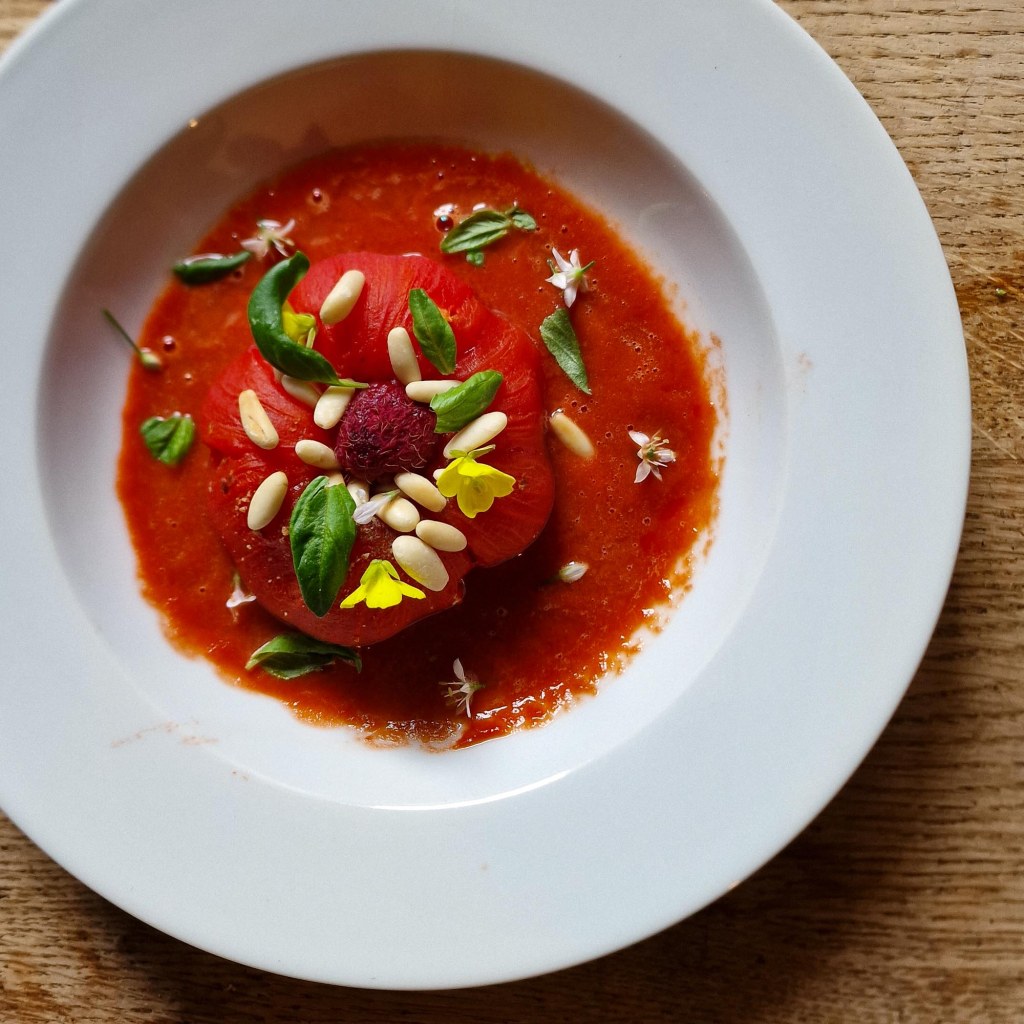 Eine confierte Tomate mit Himbeeren, Raps- und Zedernkernen und einem leichten Tomatenschaum. Ohne Bild, nachgekocht.