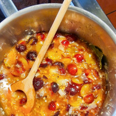 (3) Zwiebeln in Sonnenblumenöl andünsten, Damassons und Zucker zugeben und langsam aufkochen, den abgesiebten Essigsud unterrühren und etwa 30 Minuten simmern lassen, bis der Chutney bindet.