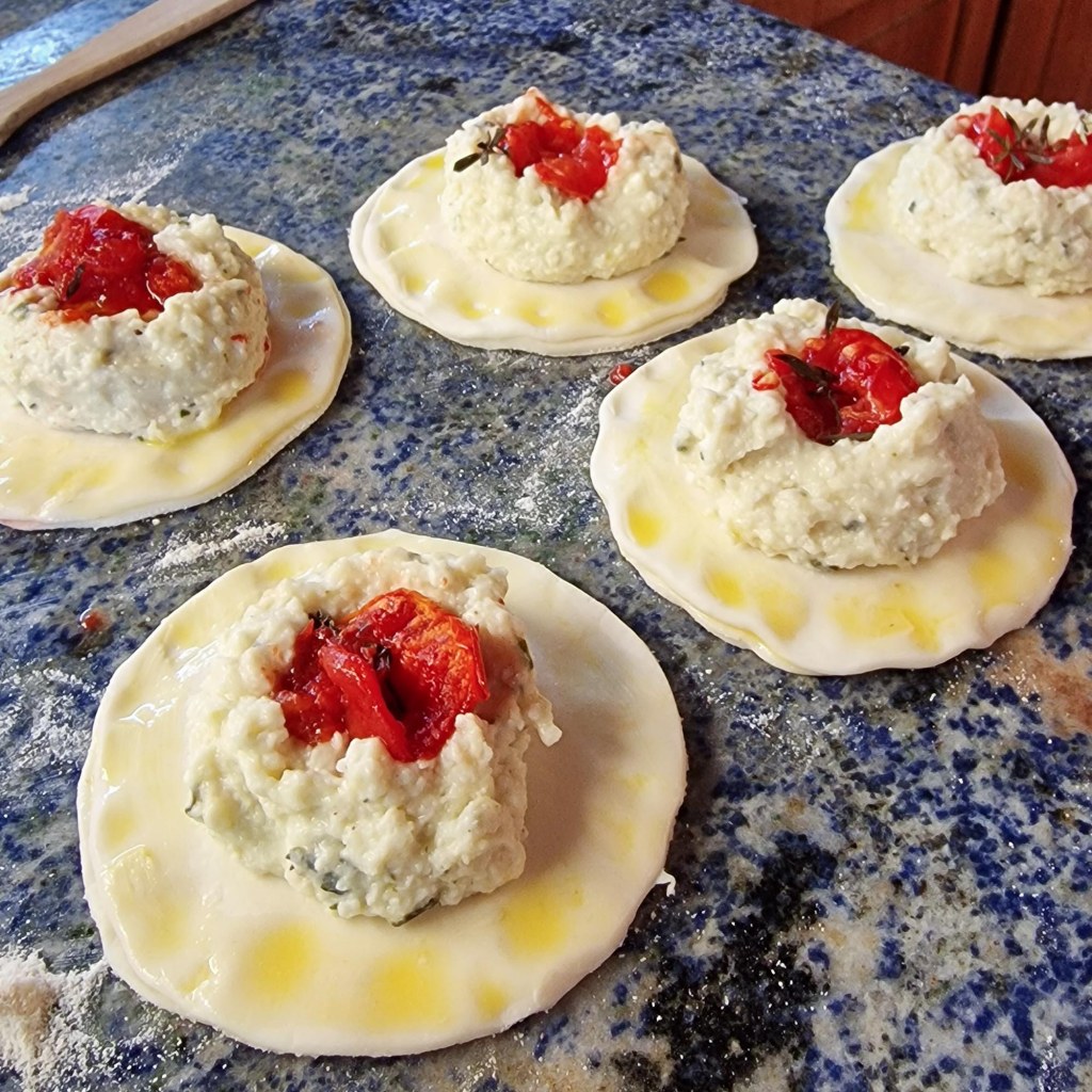 (10) Die Füllung mit der letzten, grösseren Scheibe abdecken und mit den Fingern rundherum andrücken, um die Ränder zu verschließen. Rund um die Füllung mit einem Glas von entsprechender Grösse leicht anpressen. Zum Schluss die Rustici mit einem 7 cm)Teigausstecher exakt ausstechen.