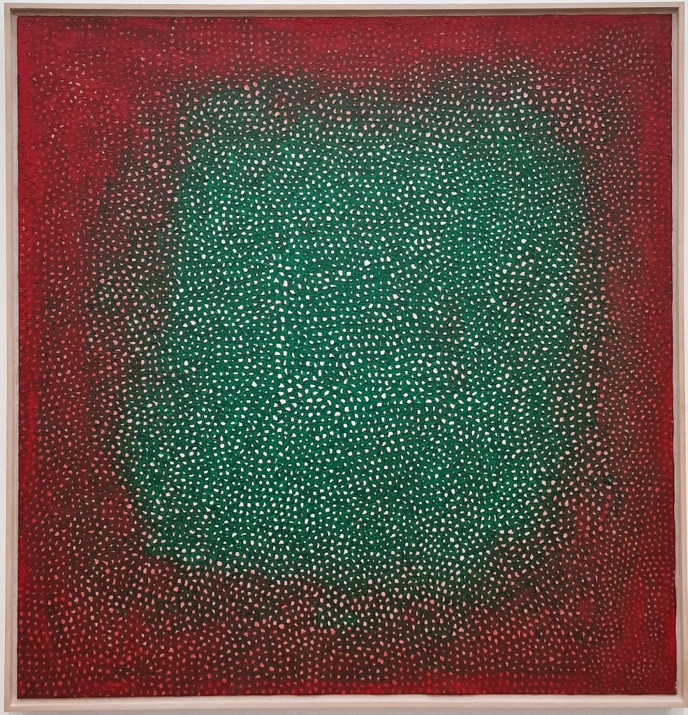 Insgesamt 12 Jahre arbeitete Yayoi Kusama an der Serie „my eternal soul“ von 38 Gemälden. Oft an mehreren tableaux gleichzeitig, intuitiv und ohne Gesamtkonzept.