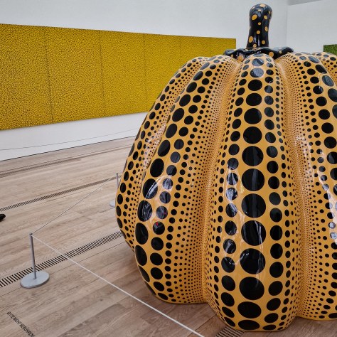 Der Kürbis ist ein wiederkehrendes Motiv, das für Yayoi Kusama Geborgenheit und Persönlichkeit symbolisiert. Die Punkte (Polka Dots) sind die Markenzeichen, mit denen sie ihre Körper, Objekte und sogar ganze Räume bedeckt,