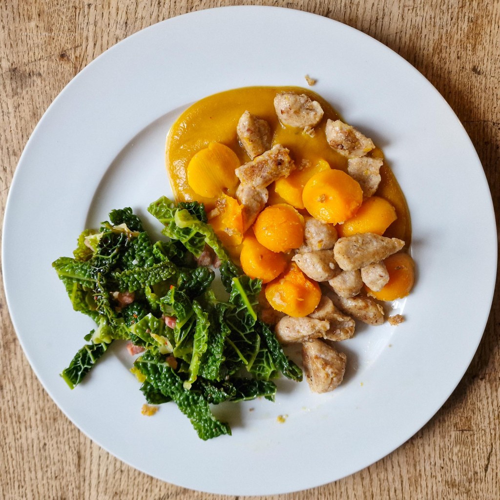 Zuhause ein dilettantischer Versuch, die Polka Dots auf einen Teller zu bringen: Kürbiskugeln, Vollkorn-Pizokel, Kürbissauce und Wirsing mit Speck.