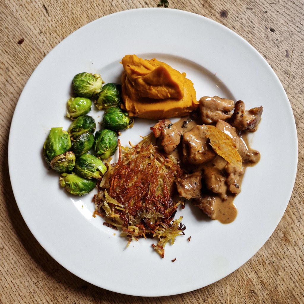 oder: mit Rosenkohl, Rösti und Kürbispüree und den chips aus der gebratenen Hühnerhaut.