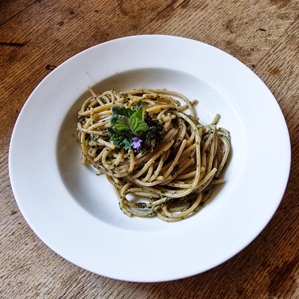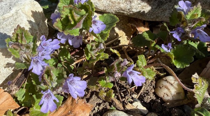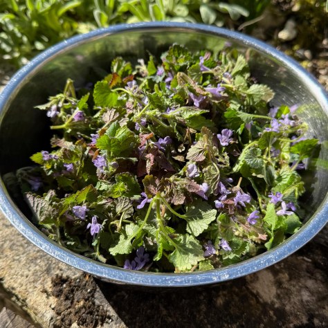 Jeder Gartenbesitzer kennt sie, die Gundelrebe, weiblich. Ein „Unkraut“. Deshalb hat man ihr wohl auch den männlichen Alternativ-Namen Gundermann beigegeben. Er findet sich an Waldrändern, arbeitet sich aber auch von Gartenhecken aus mit kriechenden Ausläufern in den Rasen vor. Im April beginnt Sie blau-violett zu blühen. Aus den jungen Spitzen samt Blütern macht Frau H. einen Pesto zu Pasta.