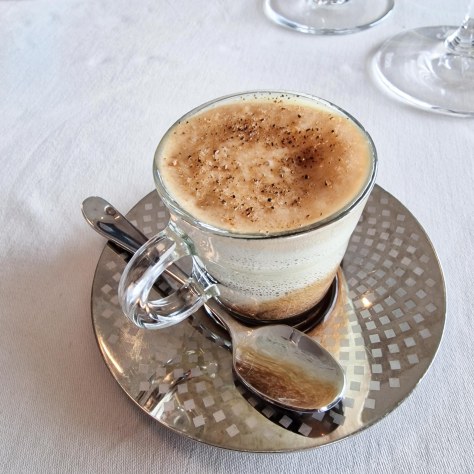 „La morille sur son nuage“, (die Morchel auf ihrer Wolke), ein im gläsernen Cappuccinotässchen servierter Morcheljus mit Morcheln, überdeckt mit Kartoffel-Espuma und gerösteten Brotkrumen.