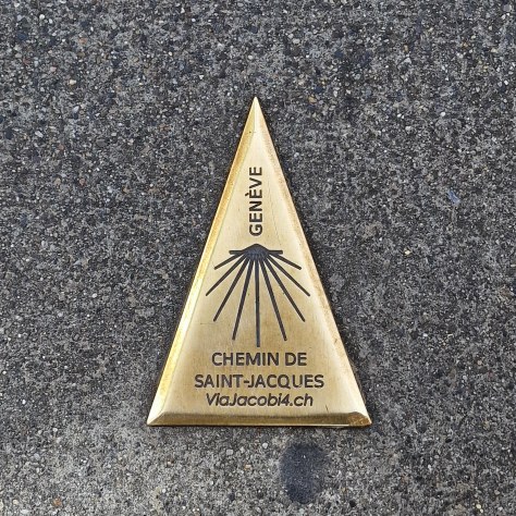 Der Fussmarsch vom Bahnhof Genf aus verläuft auf etwa 200 Metern über den geteerten Pilgerweg der Via Francigena.