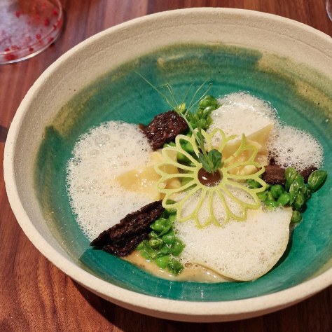 Salzkartoffeln mit Schnittknoblauch, -Grün und -Samen. Wurst, Weisskraut mit Quittenwürfeln, Zwiebel, Vin jaune und einem Schuss Sojasauce. Im Glas: Süssmost. Das braucht kein Rezept.