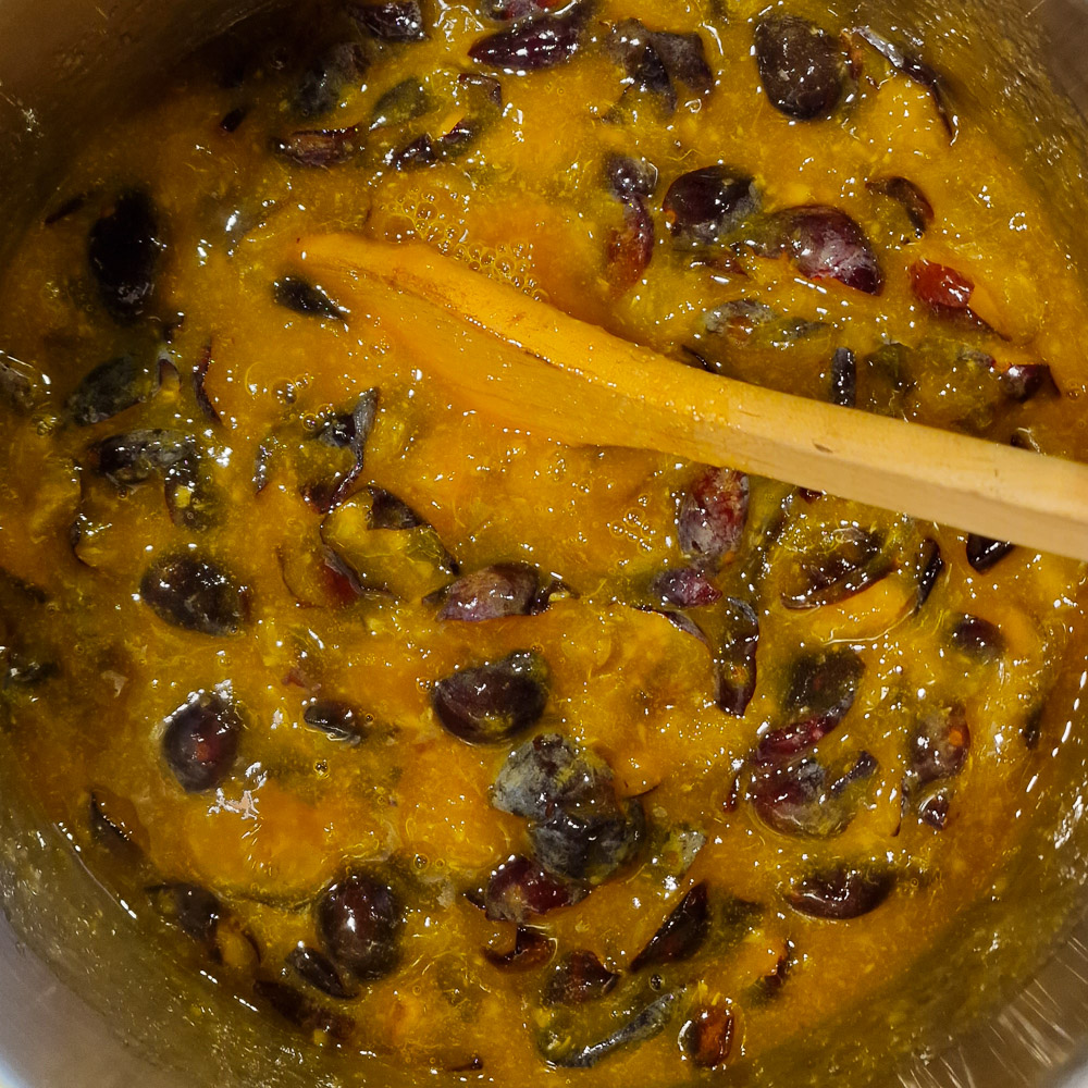 (1) Quitten auf geeignete Weise entsaften: Auskochen oder im Dampf- oder Druckentsafter. Bei mir 1.3 kg Quitten mit einem Tuch abreiben. Nach Bedarf schälen, Kernhaus entfernen und hacken. Quittenfleisch auf der Röstiraffel reiben. Beides auf die Lochbleche über die Saftschale montieren und 10 Min/100°C, danach 40 Minuten/120°C entsaften.