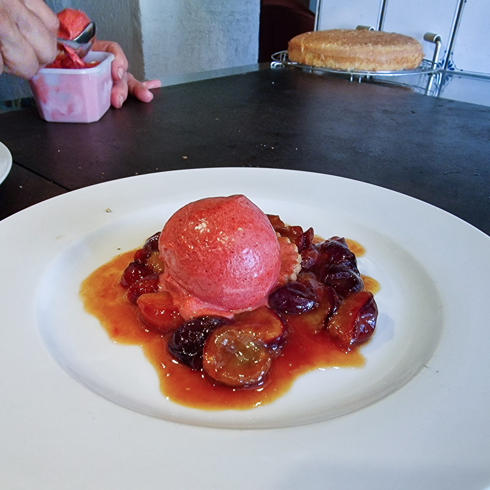 (5) 20% Zucker in das Konzentrat rühren, einmal aufkochen, abkühlen und in der Eismaschine zu einer Quittenglace rühren. Ein Softeis von unerwarteter Konzentration des Geschmacks