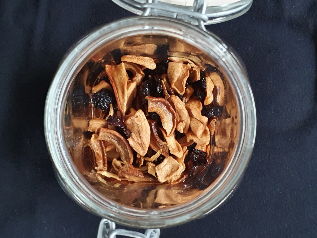 (1) Dörrfrüchte (ohne Nüsse) in einem verschliessbaren Glas mit den Flüssigkeiten mischen und 2 Tage verschlossen marinieren und quellen lassen. Glas gelegentlich schütteln oder wenden. Früchte vor der Brotherstellung in einer offenen Pfanne unter häufigem Umrühren erwärmen, bis der Alkohol nahezu verdunstet und die Flüssigkeit zu Sirup eingedampft ist. Danach die Nüsse untermischen.