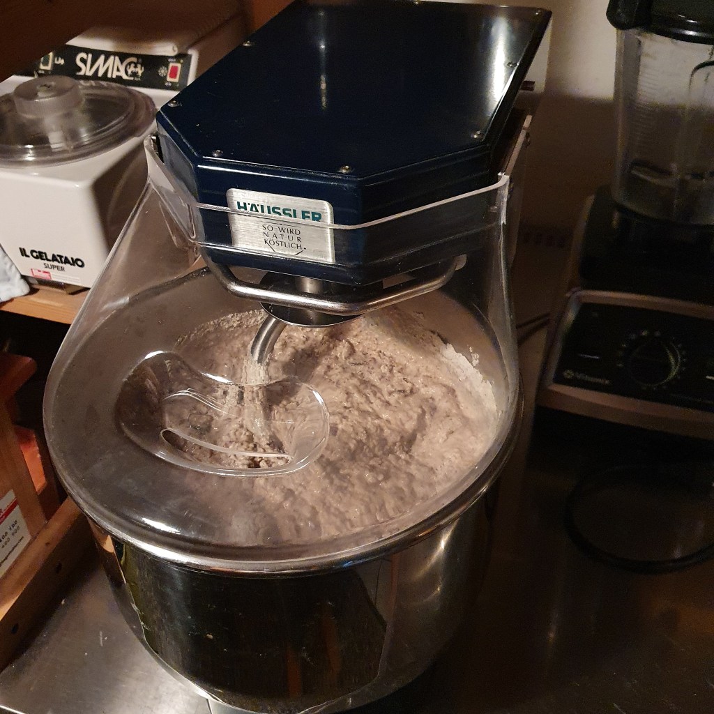 400 g Wasser 20 g Salz 1740 g Brühstück 1000 g Sauerteig (Rest als neues Anstellgut einlagern) 1000 g Vollkornmehl