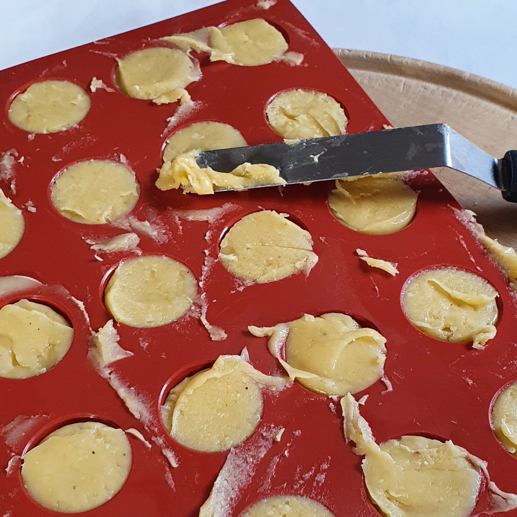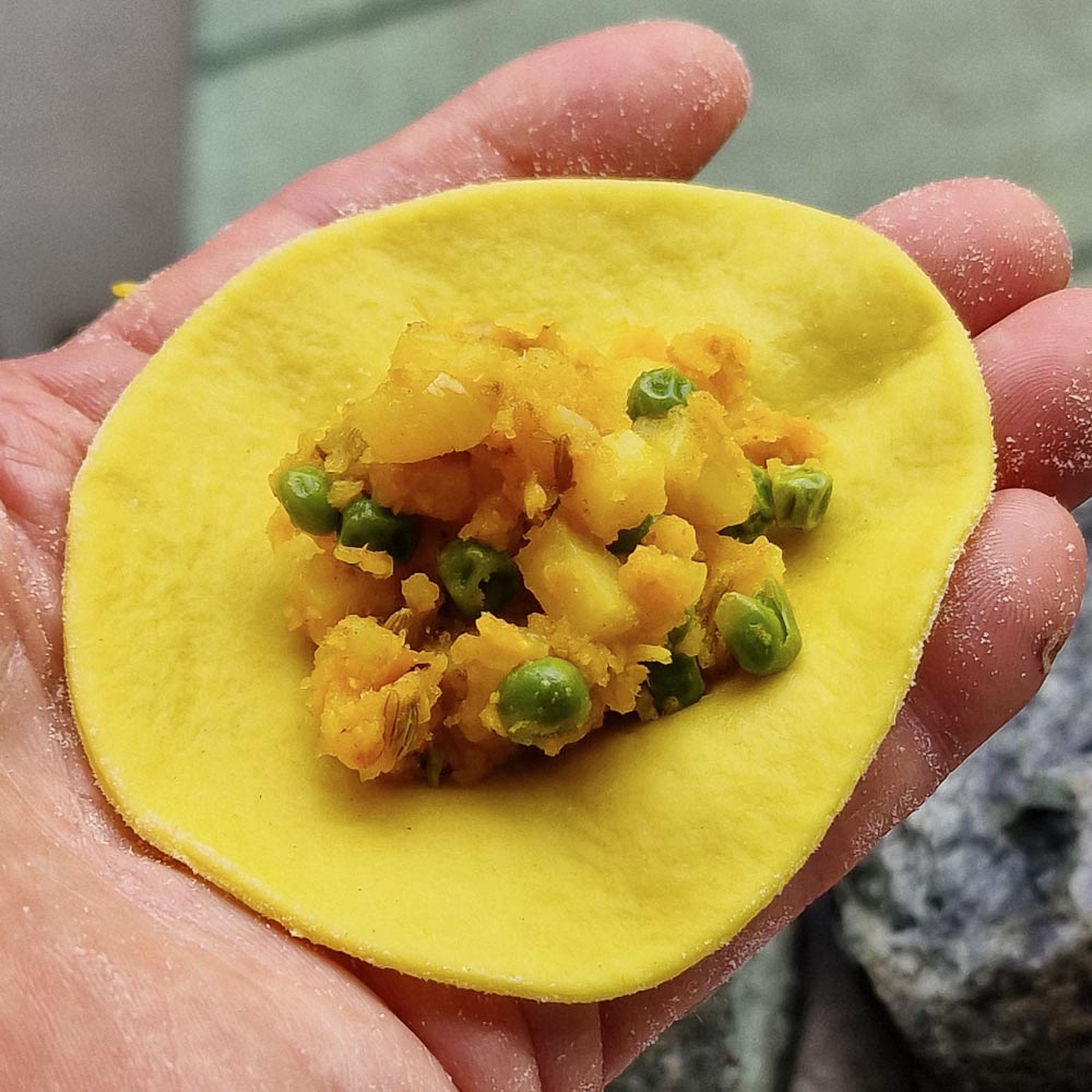 (10) Die Füllung mit der letzten, grösseren Scheibe abdecken und mit den Fingern rundherum andrücken, um die Ränder zu verschließen. Rund um die Füllung mit einem Glas von entsprechender Grösse leicht anpressen. Zum Schluss die Rustici mit einem 7 cm)Teigausstecher exakt ausstechen.