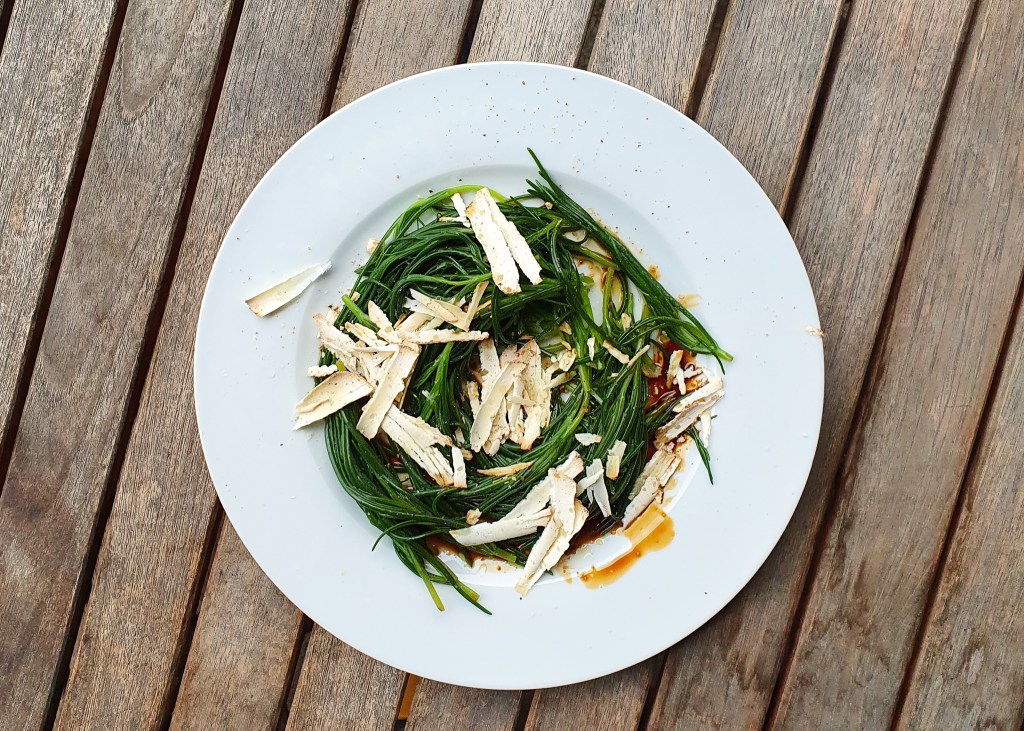 Der erste Gang kann als gutes Beispiel der Küche von Tomofumi Uchimura gelten: sehr elaboriert, wild, verspielt. Aromen nicht immer fokussiert, doch hübsch angerichtet: Avocadoquenelles, Grünspargel, Gurkensorbet mit Gin Tonic, Orangenvinaigrette, Knusper, Tupfen und Blüten.