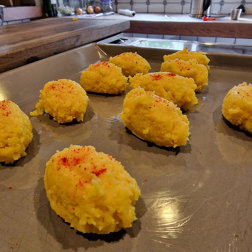 (6) Ofen auf 160°C runter stellen. Dann das Blech mit den Polentagnocchi dazu stellen und 10 Minuten aufwärmen.