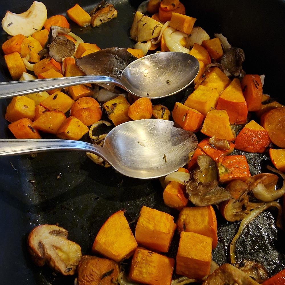 (5) Während der Maisbrei gart, den Kürbis in Würfel schneiden, Zwiebel in Streifen, Karotten und Champignons in Scheiben, Apfel in Spalten. Karotten in einer Bratenreine in wenig Olivenöl im Ofen (200°C UL) etwas vorgaren, dann die übrigen Zutaten zugeben und 30 Minuten fertig garen. Im Ofen belassen.
