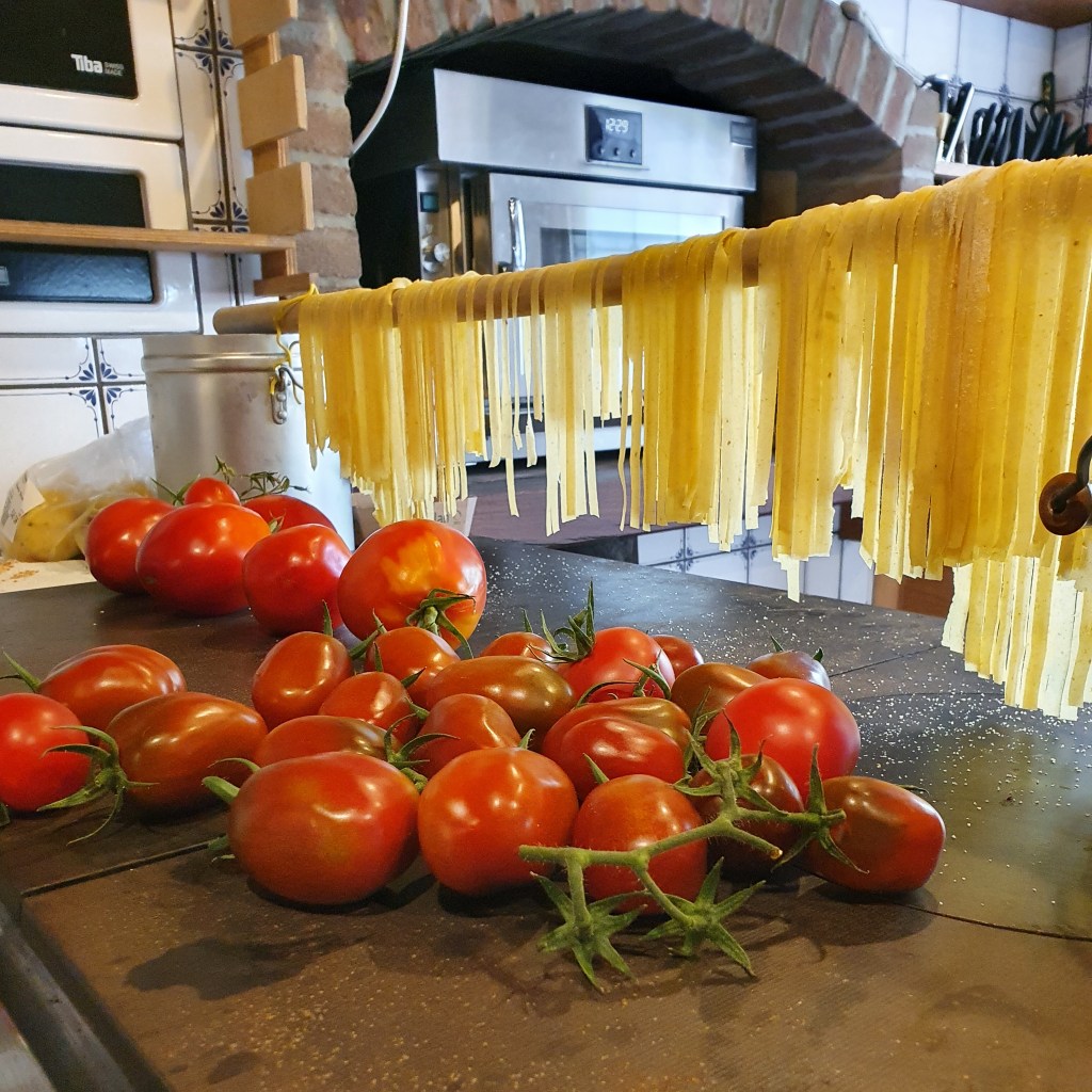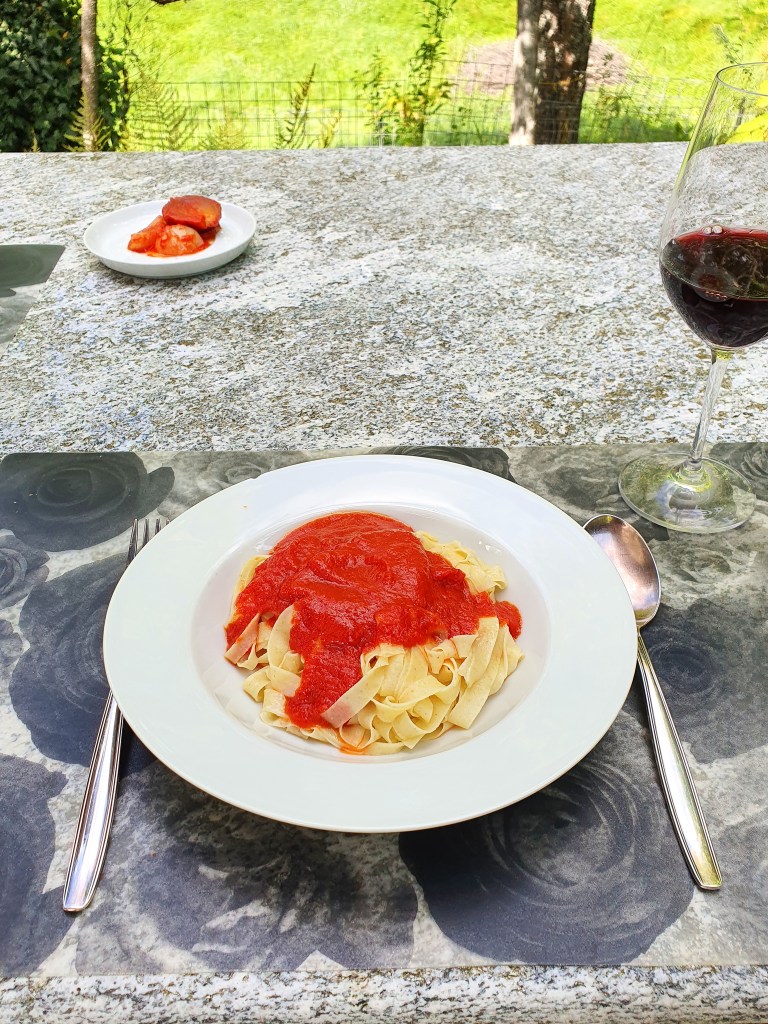 Zurück zum Rezept der Woche: Zuhause im Jura kochten wir aus dem entsamten Tomatenfleisch die Tomaten-Butter-Sauce nach Marcella Hazan (Danke für Erinnerung und Vorkochen an Arthurs Tochter). Dass dazu selbst gemachte Nudeln gehören, ist Ehrensache.