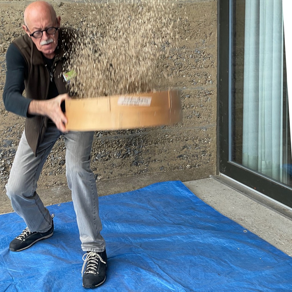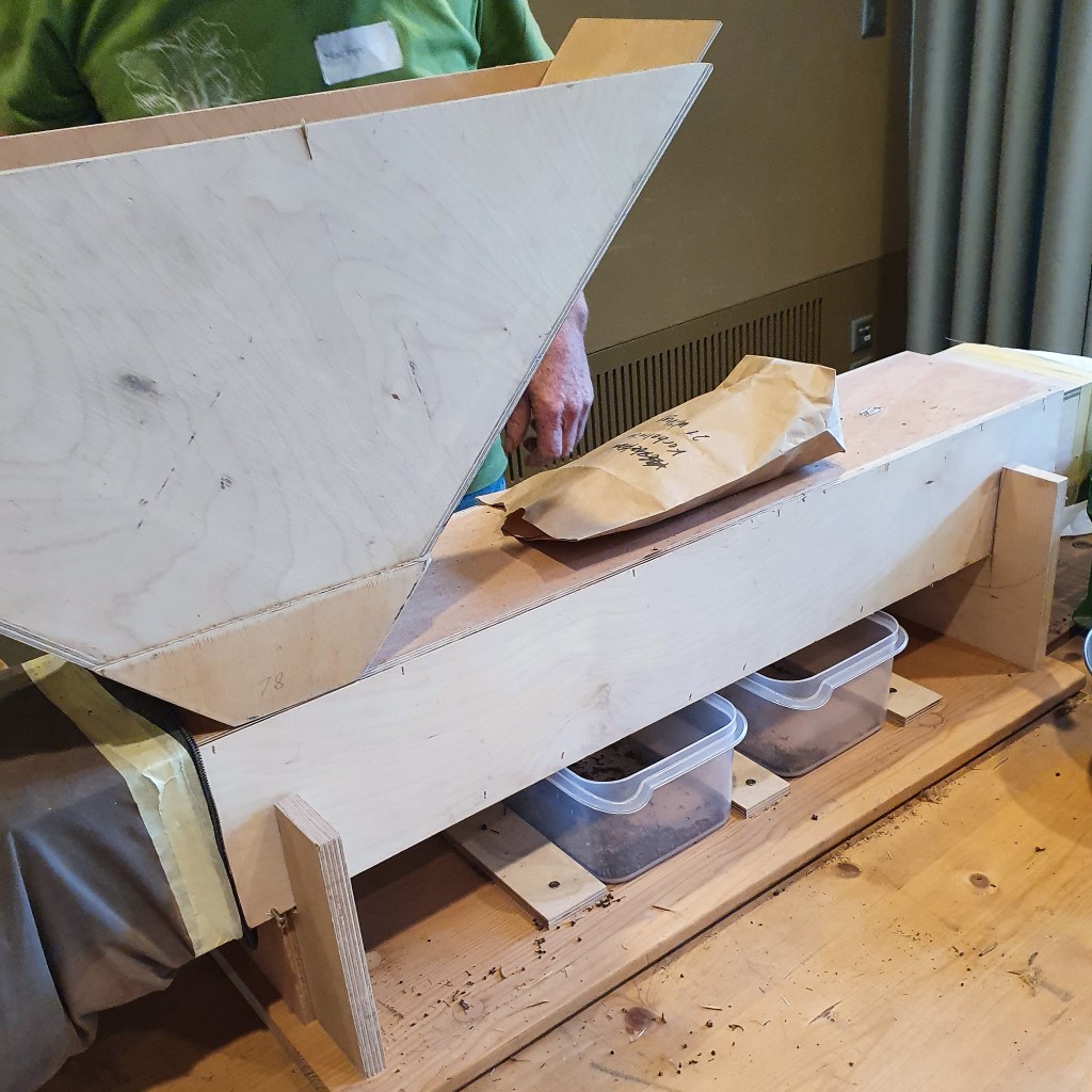 Mit einer vom Tagungsleiter gebastelten Windsichtungsmaschine werden Samen, die sich hiefür eignen, in einem Luftstrom in vier verschieden feine Fraktionen getrennt und von Verunreinigungen befreit.