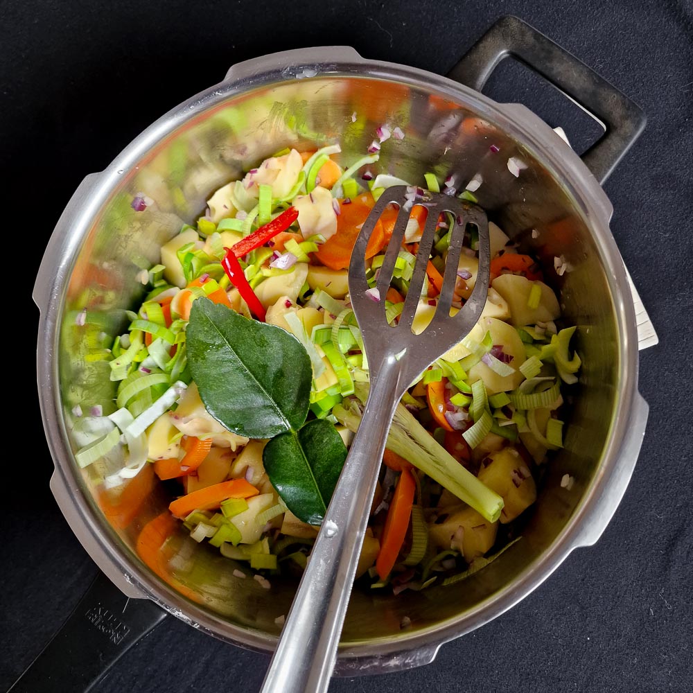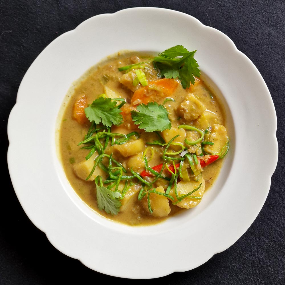 500 g Kartoffeln (mehlig kochend, L.: Röseler) 1/2 rote Zwiebel (L.: Manchon) 1 Stange Lauch (ca. 150 g) 1 Karotte (ca. 100 g) 1 Knoblauchzehe, fein gehackt 250 ml Kokosmilch 1 Stengel Zitronengras, gequetscht 1 TL Ingwer, geschält, gehackt 1 kleine Chilischote, entkernt 2 Kaffirlimettenblätter 1 TL Curry Anapurna 1 TL Curry Madras 1/2 TL Korianderkörner, zerstossen ca. 3 dl Gemüsebrühe 50 ml Gemüsejus (siehe hier) Salz zum Abschmecken bzw. Garnieren: ca. 1 EL Limettensaft, 1/2 Limettenabrieb, Korianderblätter