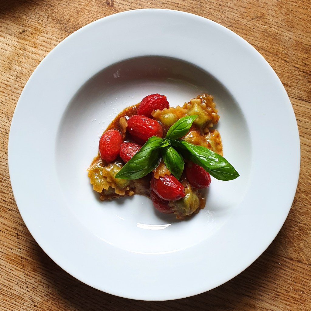 Was so einfach aussah, war jedoch technisch recht anspruchsvoll. Ich hatte jedenfalls mit dem Formen der Tartelettes meine liebe Mühe. Im TV-Original waren die Törtchen mit einer Duxelle aus Champignons, Wurzelgemüse und Spinat gefüllt.